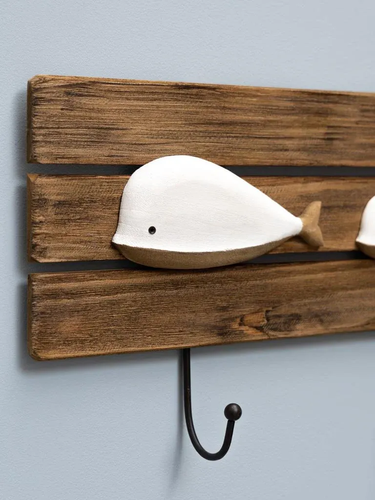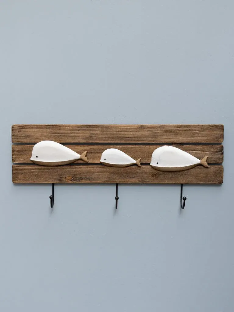 Precioso perchero con dibujos de ballenas fabricado en madera de abeto color natural y blanco con 3 ganchos de hierro de color negro.