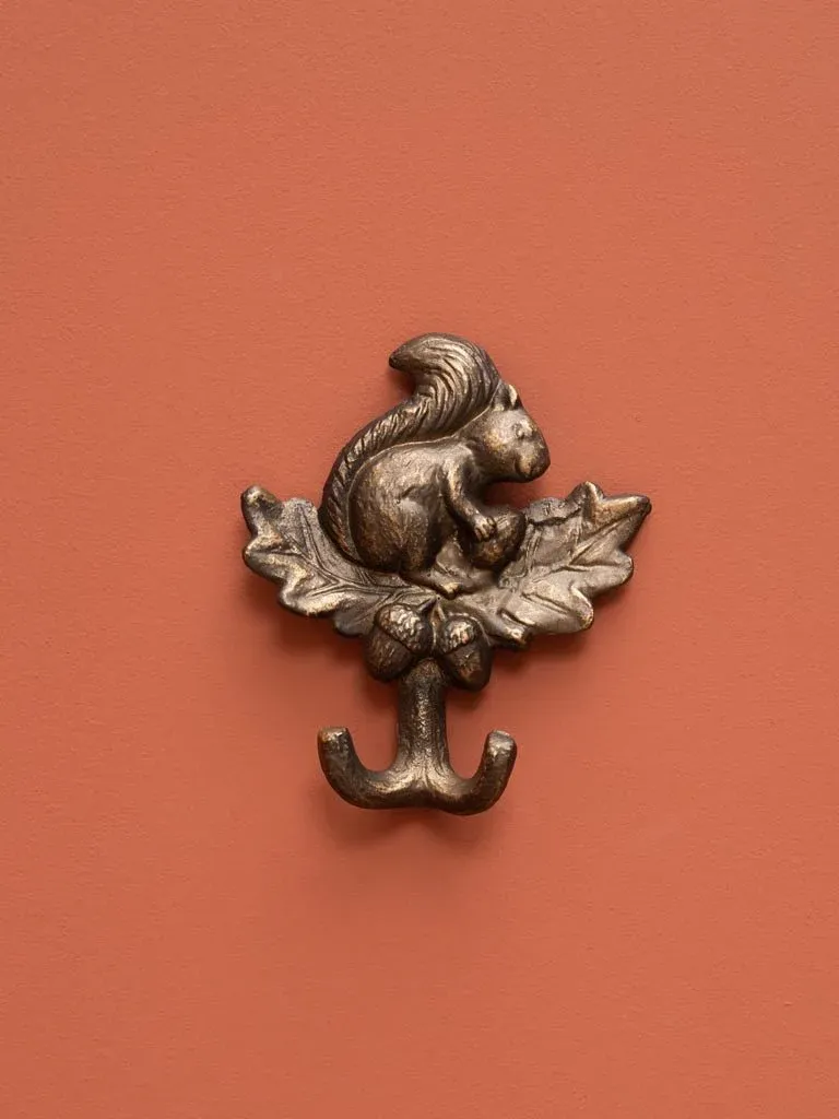Precioso perchero individual con forma de ardilla fabricado en hierro fundido en color cobre.