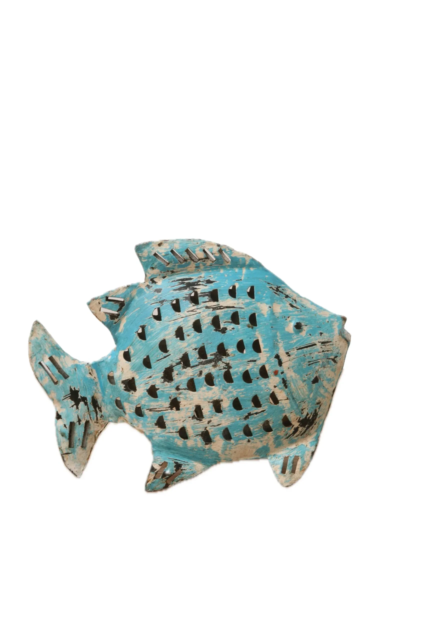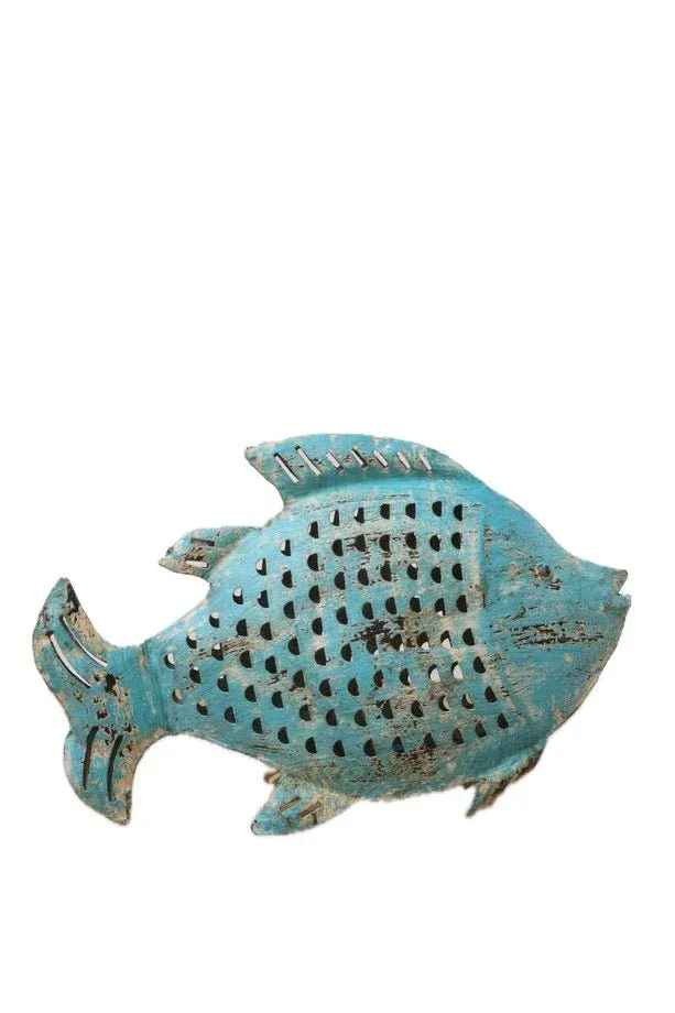 Pez fabricado en hierro de color azul claro. Se soporta sobre sí mismo de pie. Disponible en dos medidas.