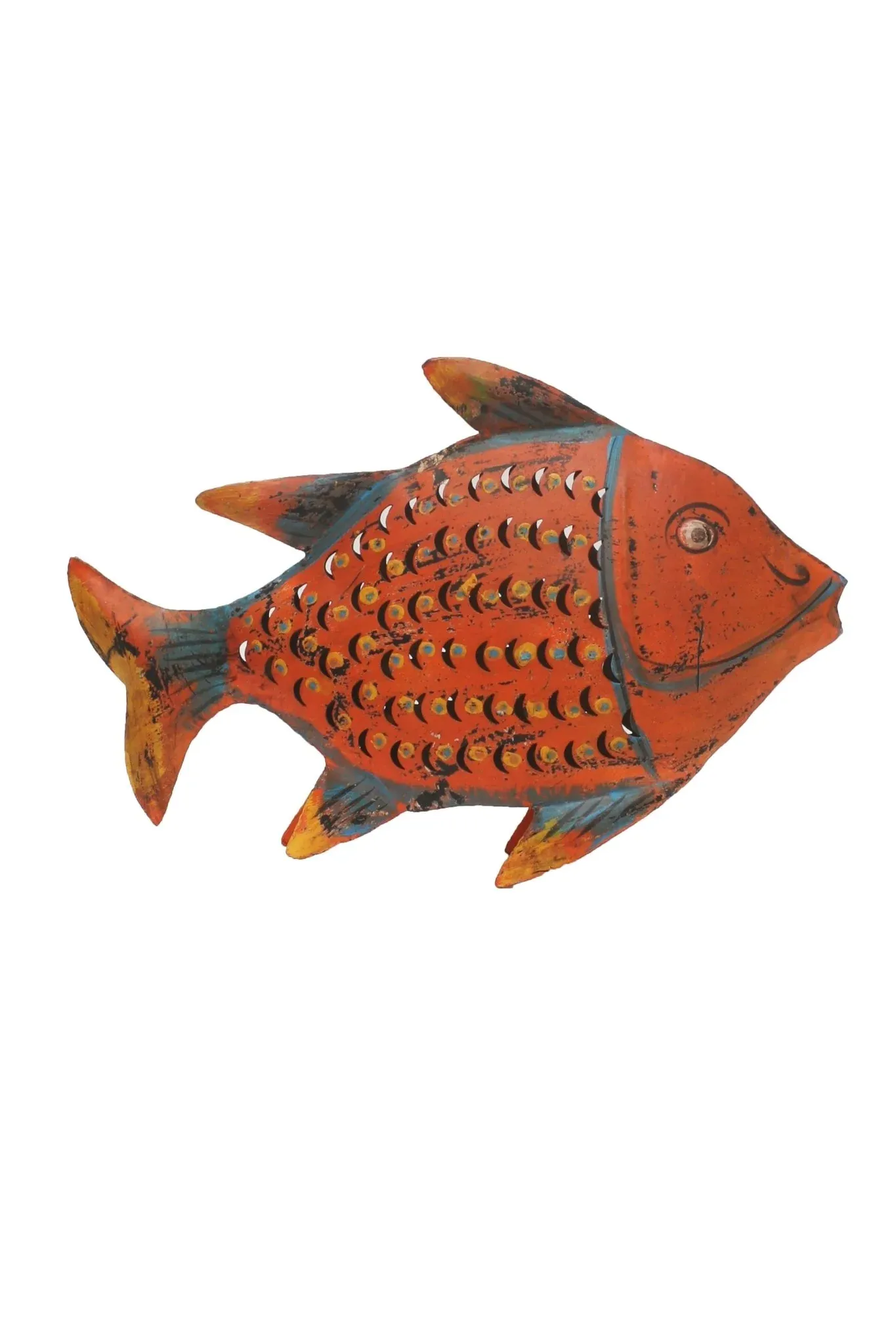 Original pez fabricado en hierro antiguo de color naranja, rojo y azul. Se soporta sobre sí mismo de pie.