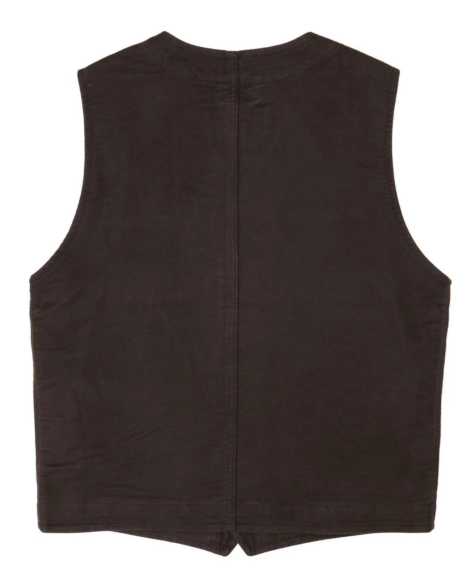 Nuestro chaleco Roamer de 1937 Moleskin marrón tierra hecho de tela de piel de topo es un chaleco de trabajo típico de principios del siglo XX. El ajuste en combinación con el material resistente la convierte en una prenda que se ve elegante pero ofrece mucha resistencia a las exigencias del trabajo diario. Está hecho de piel de topo, también llamado «cuero inglés», que está hecho de satén de algodón pesado cepillado por un lado. El molesquín es un tejido típico utilizado en la ropa de trabajo, ya que es muy duradero. La urdimbre suele estar hecha de hilo pesado torcido, mientras que la trama está hecha de un hilo más suave. Después de tejer se cepilla el lado izquierdo de la tela, dándole un tacto suave, que recuerda a la gamuza.