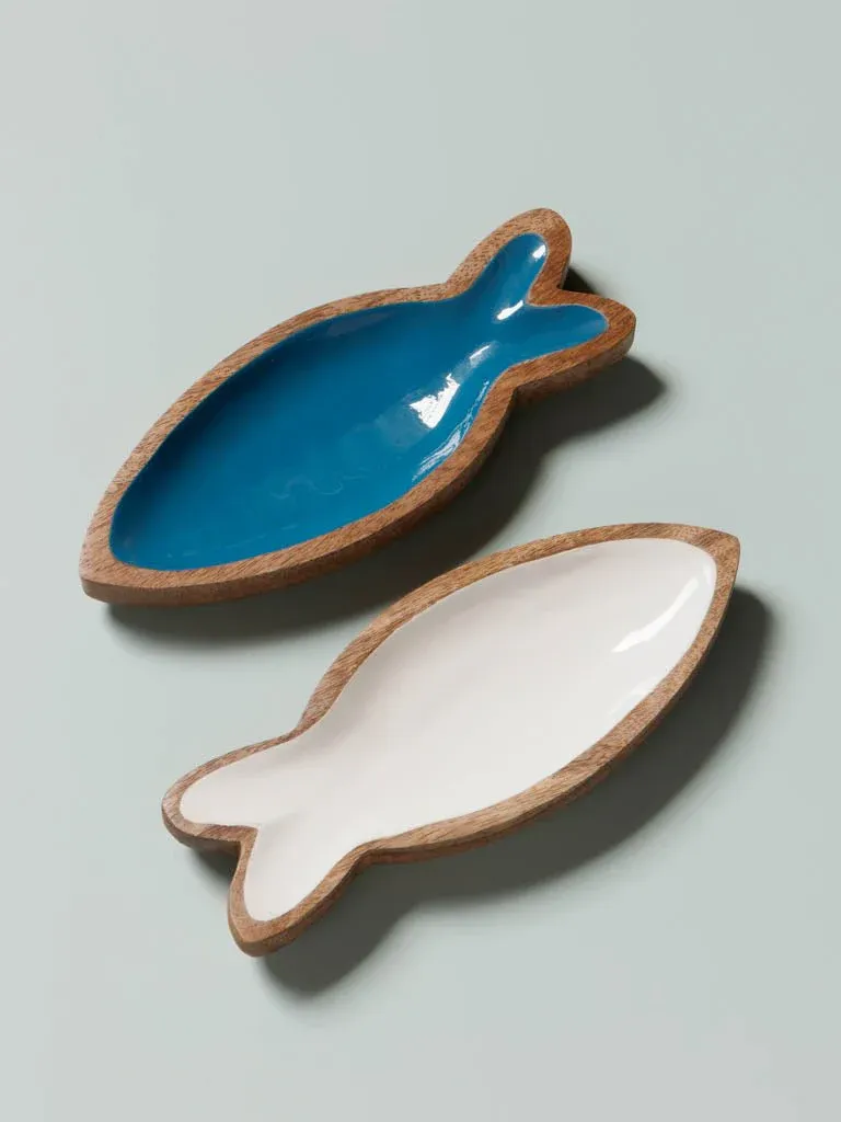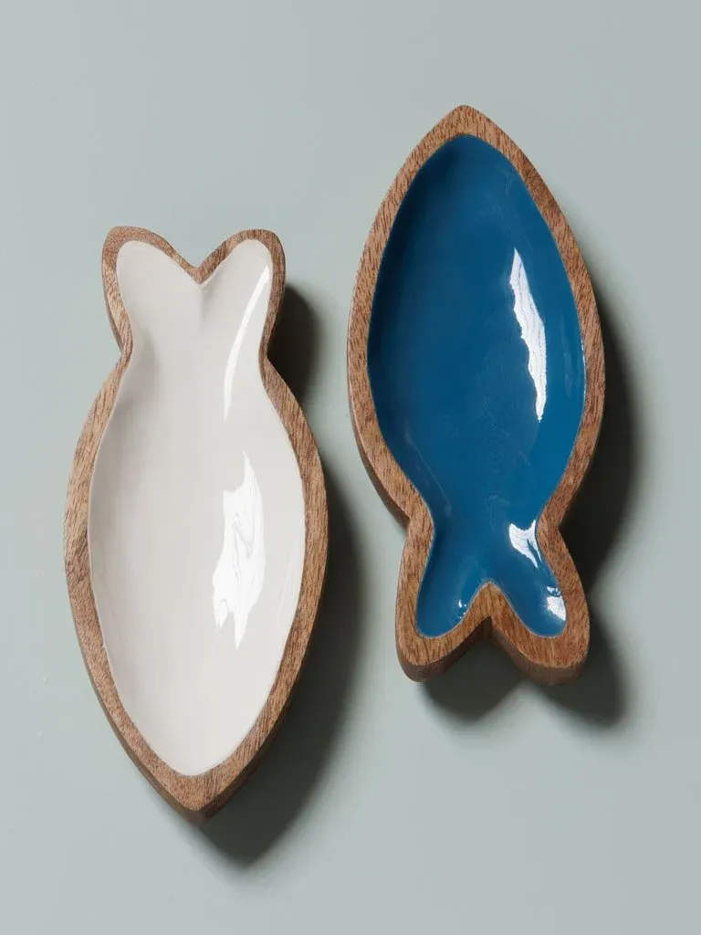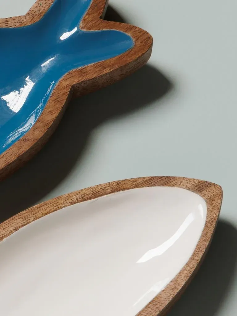 Preciso palto de aperitivo en forma de pez fabricado en madera y lacado en azul y blanco.
