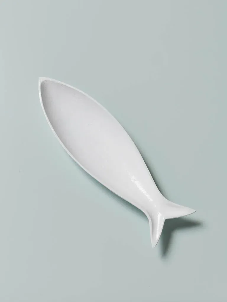 Precioso palto de aperitivo en forma de pez de color blanco.