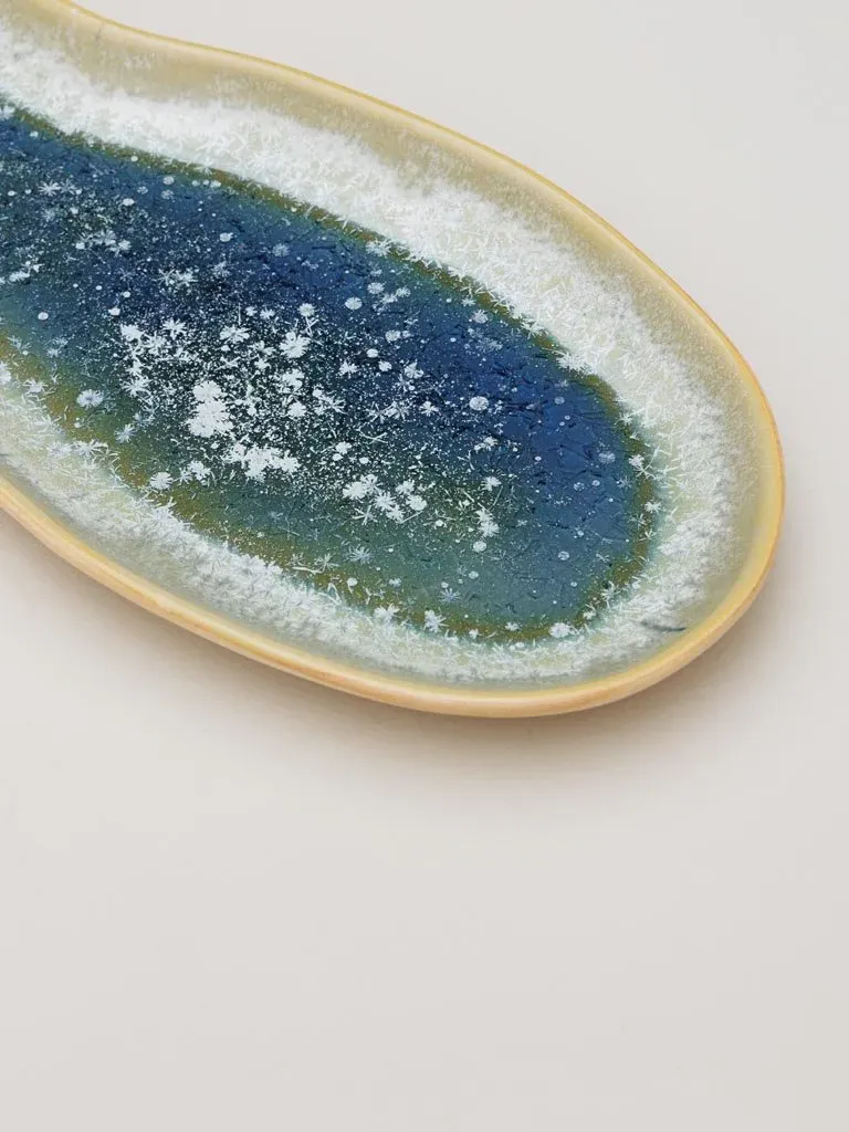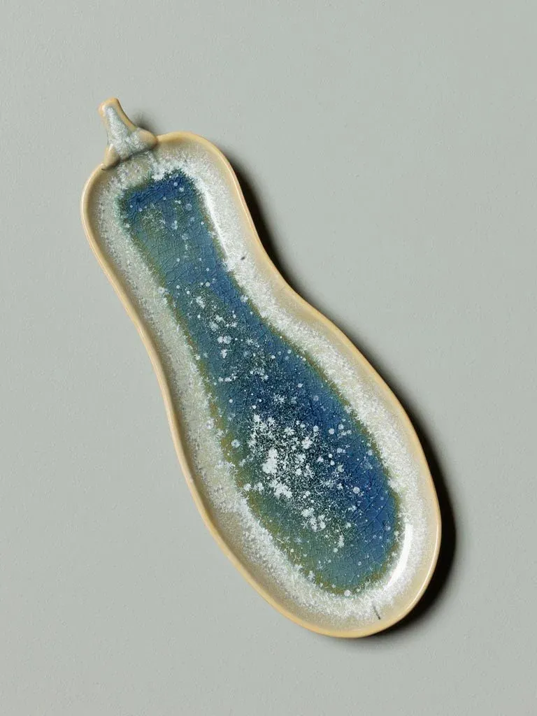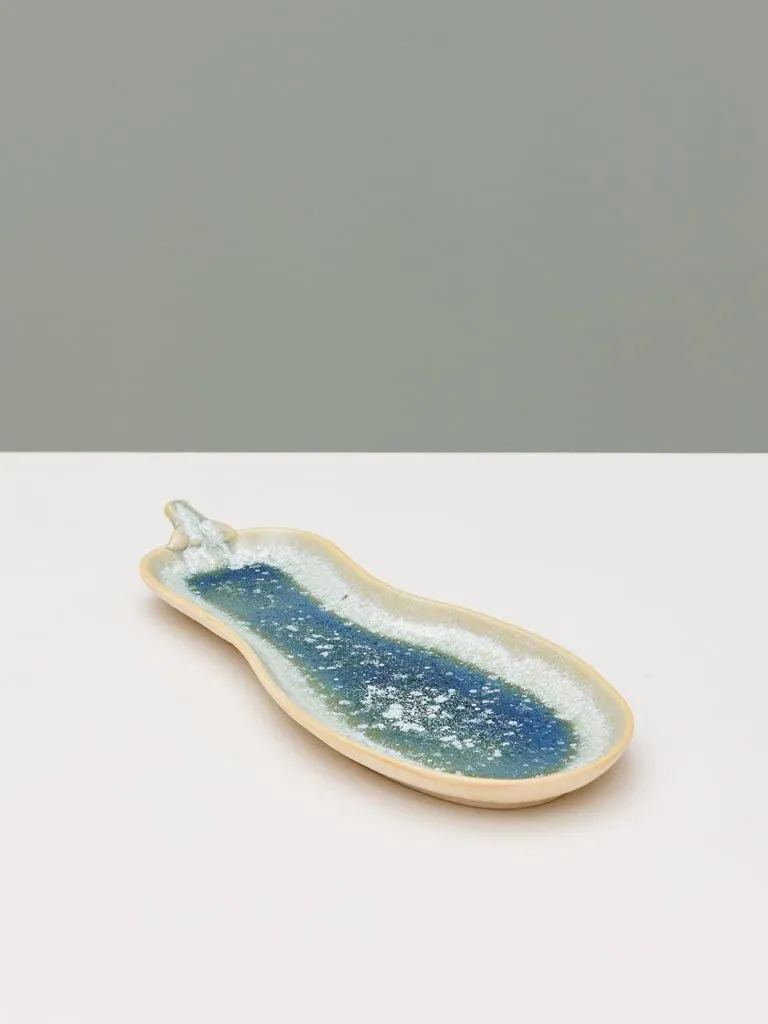 Precioso plato de aperitivo en forma de berenjena fabricado en cerámica en color tono azules y verdes.