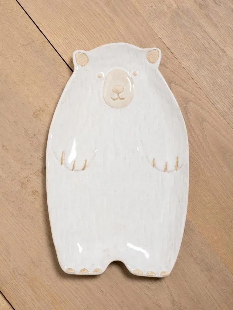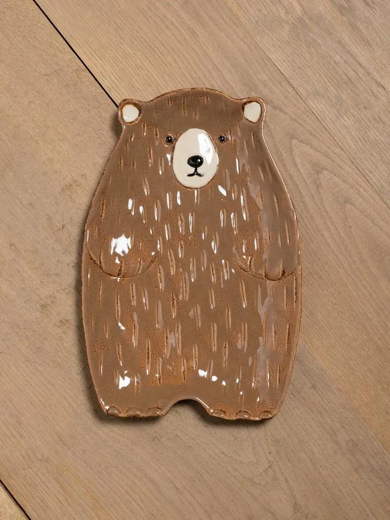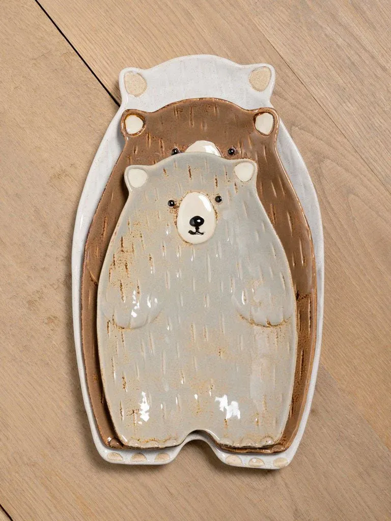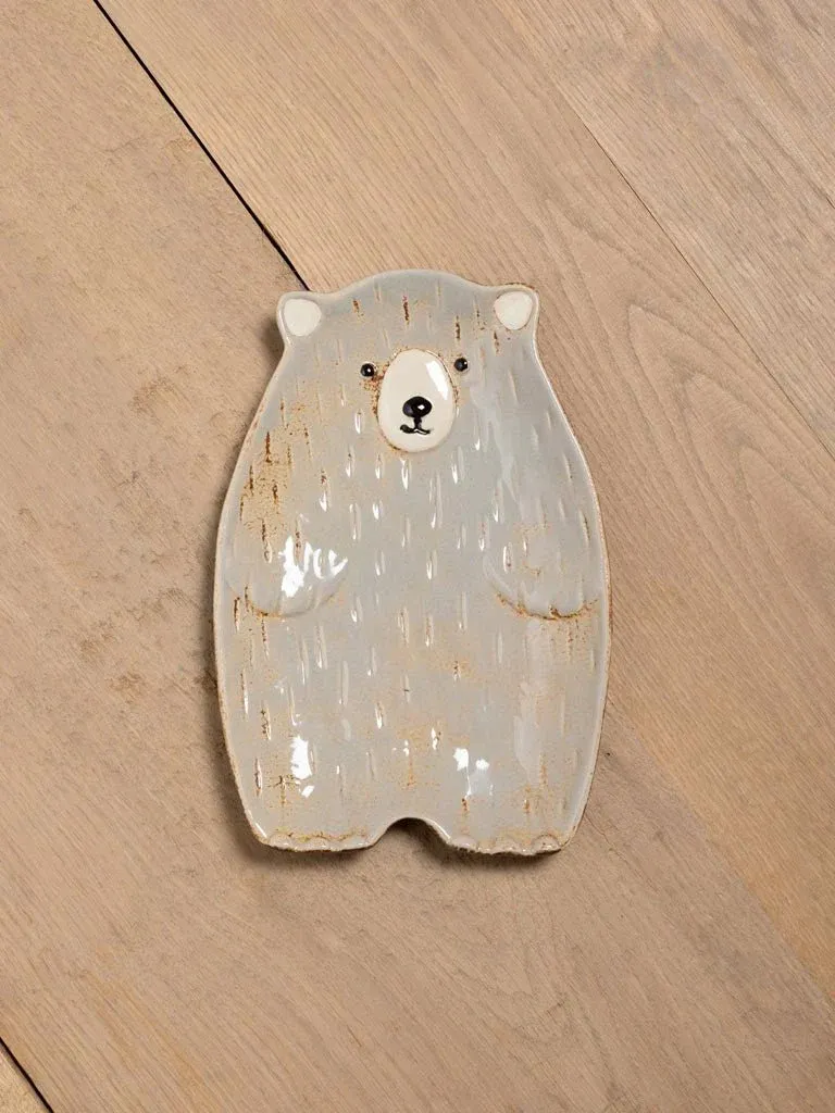 Plato de aperitivo con forma de oso fabricado en gres de varios colores blanco, gris y marrón.