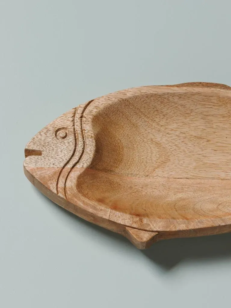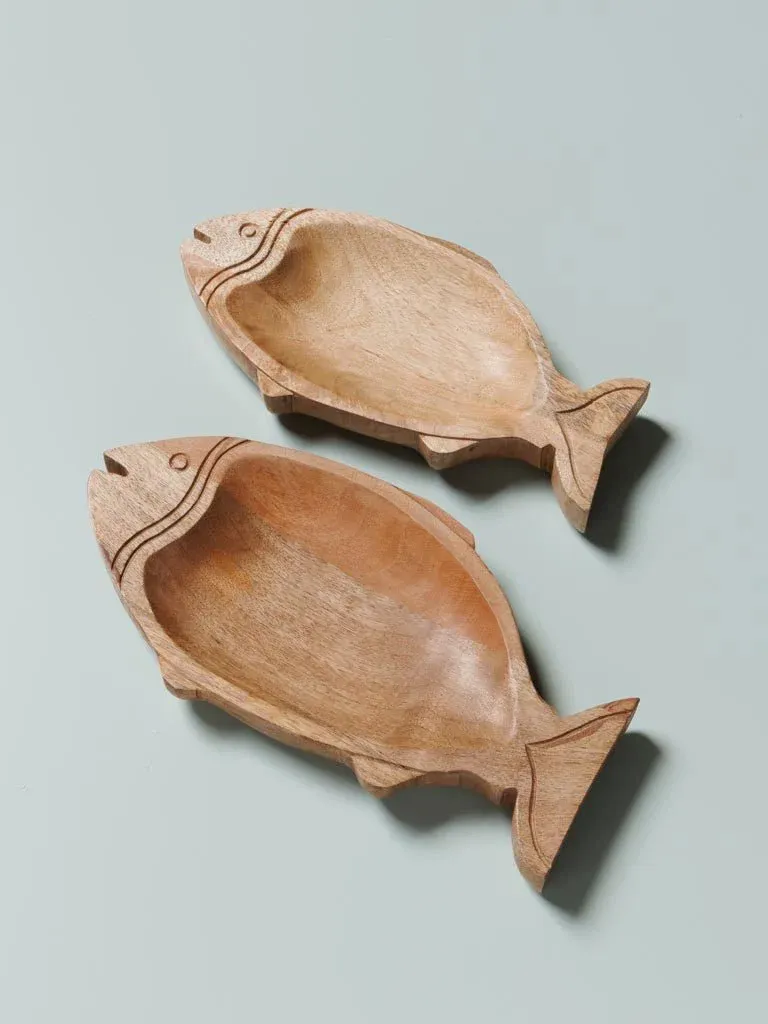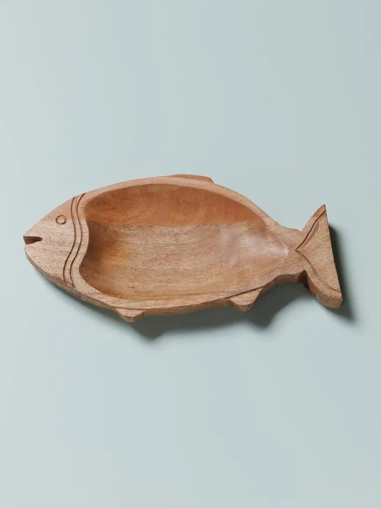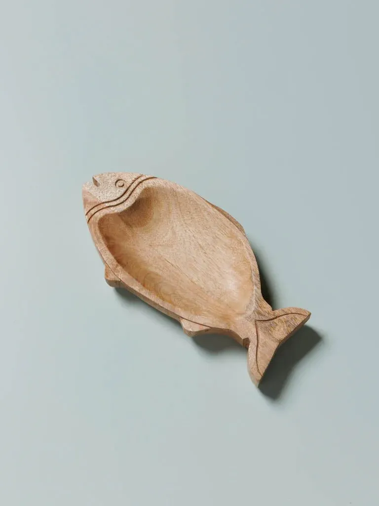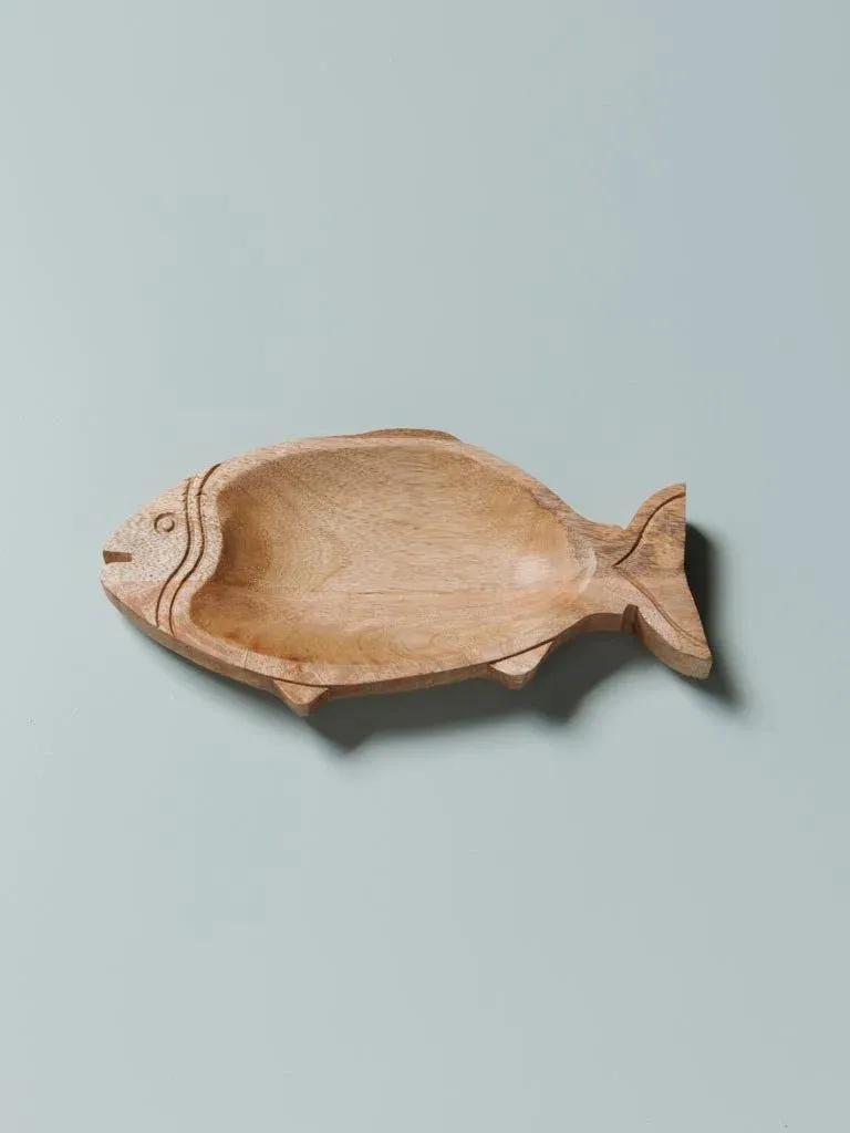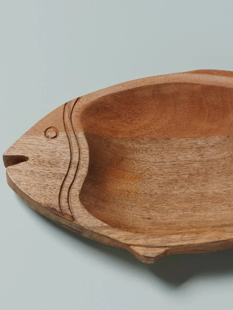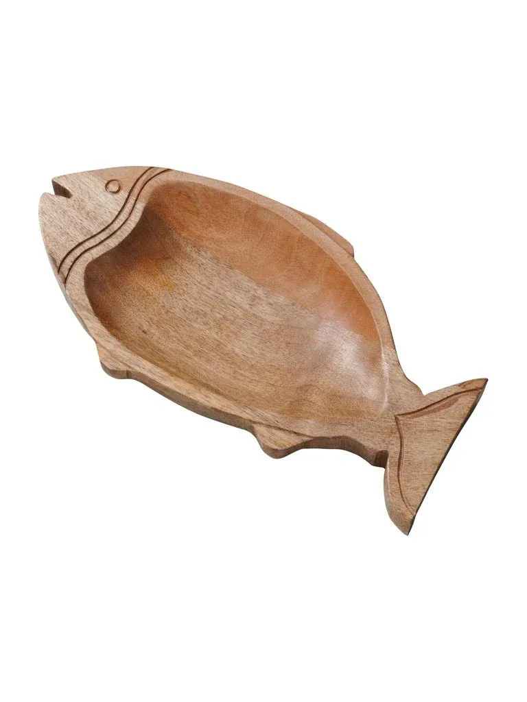 Precioso plato de aperitivo en forma de pez fabricado en madera color natural. Disponible en dos medidas.