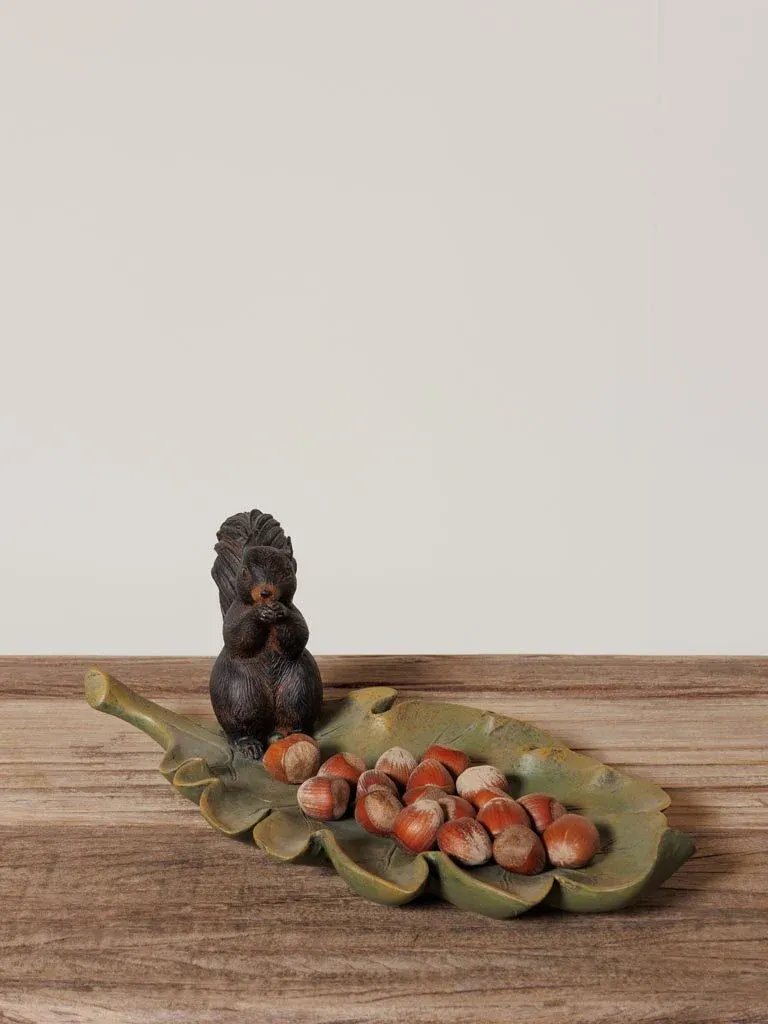Precioso plato decorativo en forma de hoja de árbol con una ardilla fabricado en resina de color verde y marrón.