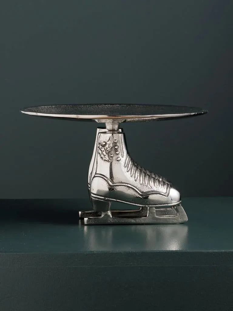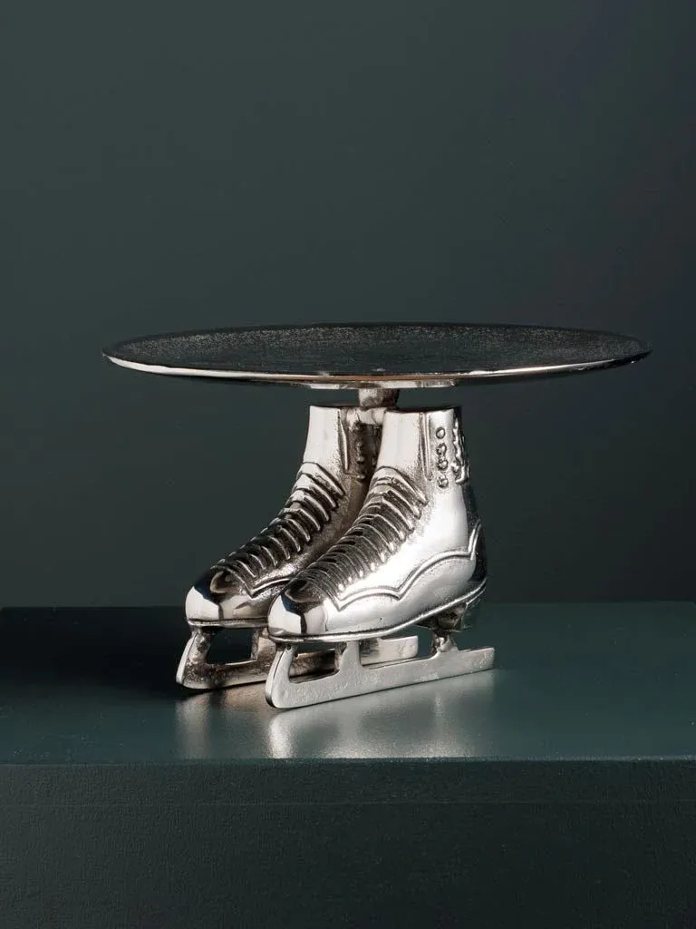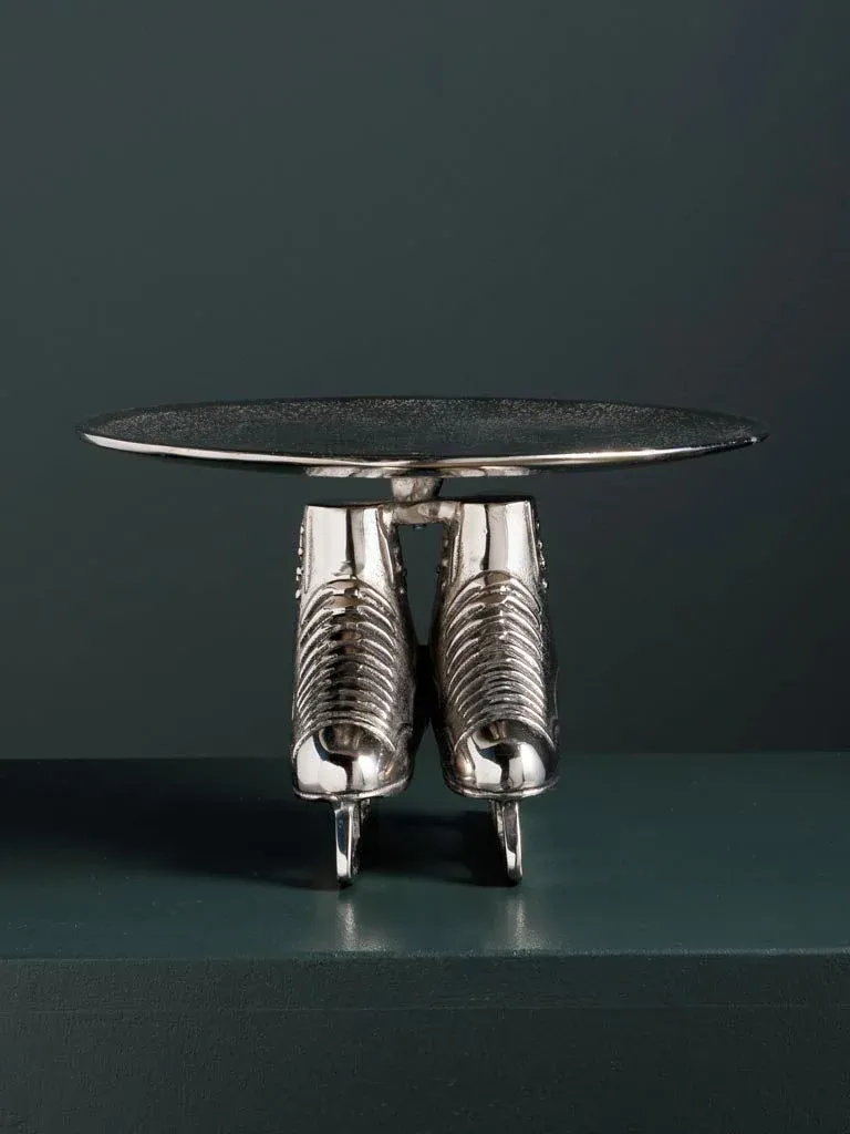 Precioso plato decorativo sobre patines fabricado en aluminio de color plateado.