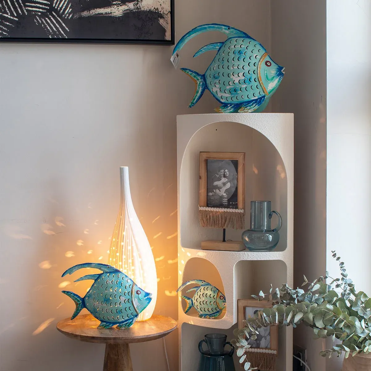 Portavela en forma de pez fabricado en hojalata multicolor con cadena para colgar. Disponible en dos tamaños diferentes.