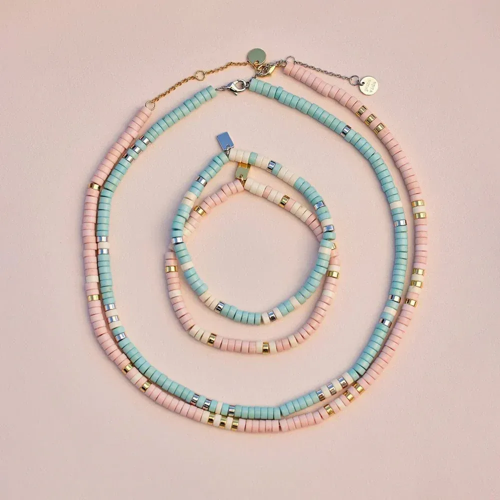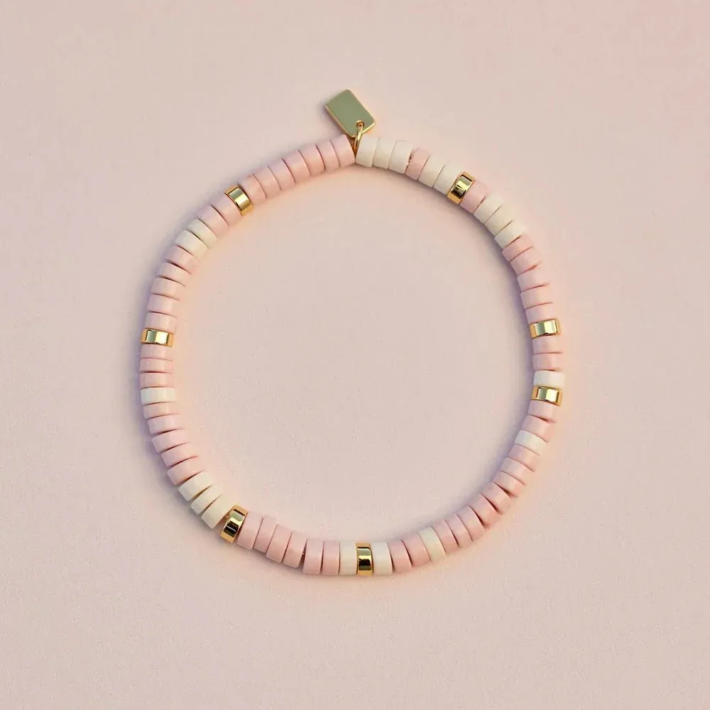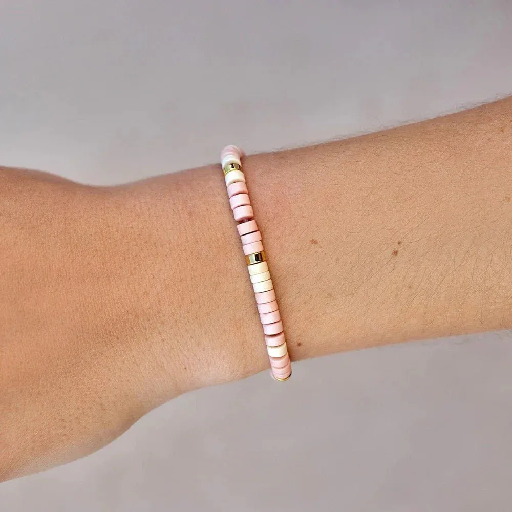 Preciosa pulsera con cuentas de dos tonos rosa y turquesa con un toque de blanco, plata y oro.