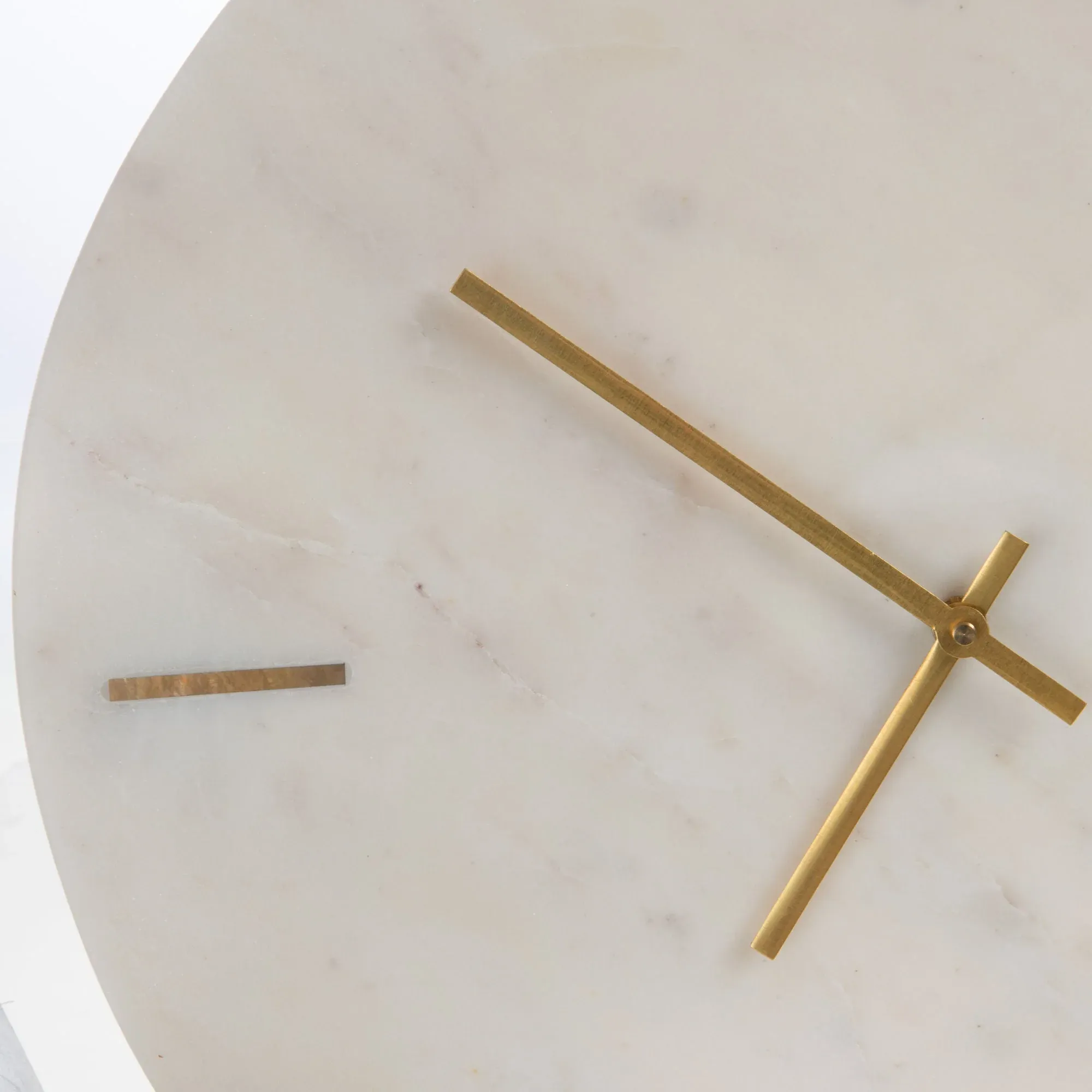 Precioso reloj de forma redonda fabricado en mármol de color blanco con agujas en dorado.