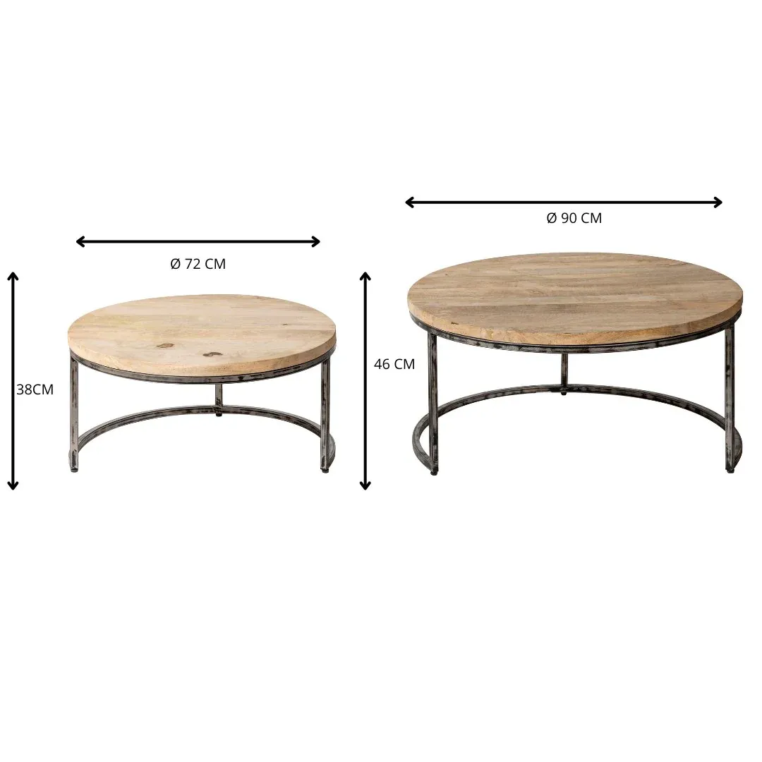 Preciosas mesas auxiliares redondas con estructura de hierro color negro y tapa de madera de mango color natural.