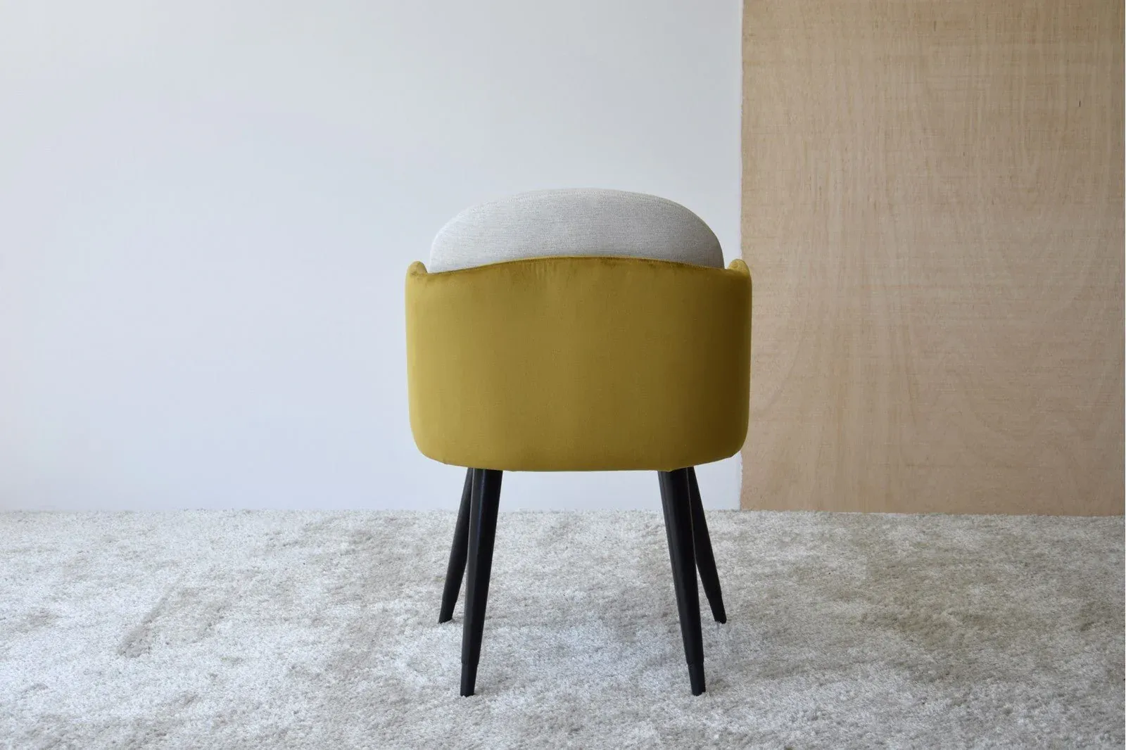Set de 2 sillas de comedor con brazos en tonos verde, ocre y beige tapizado en terciopelo con tono verde y ocre en la pieza que forma la trasera y los brazos y tapicería en beige claro en la parte interior, patas en madera color negro mate con embellecedores metálico en la parte inferior también en negro mate.