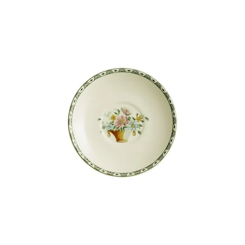 Diseñado en 1932, el decorado bucólico de Canasto Floral lleva todo el encanto del estilo naturalista inglés. Los colores pastel y azucarados, como la elegancia discreta de su orla Art Déco, se prestan idealmente a la informalidad de las mesas campestres.