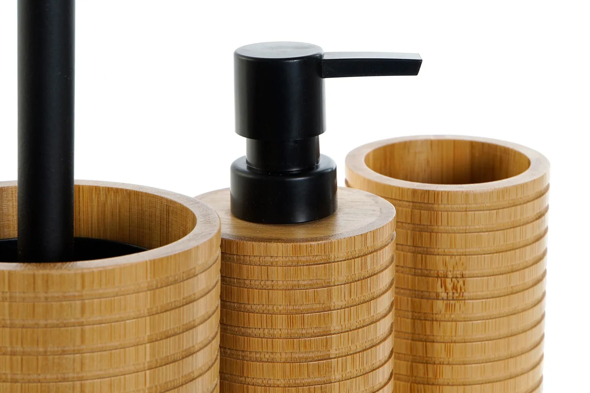 Precioso set de 3 piezas para el baño compuesto por: escobillero, dispensador y vaso fabricado en bambú color natural. Se venden por separado.