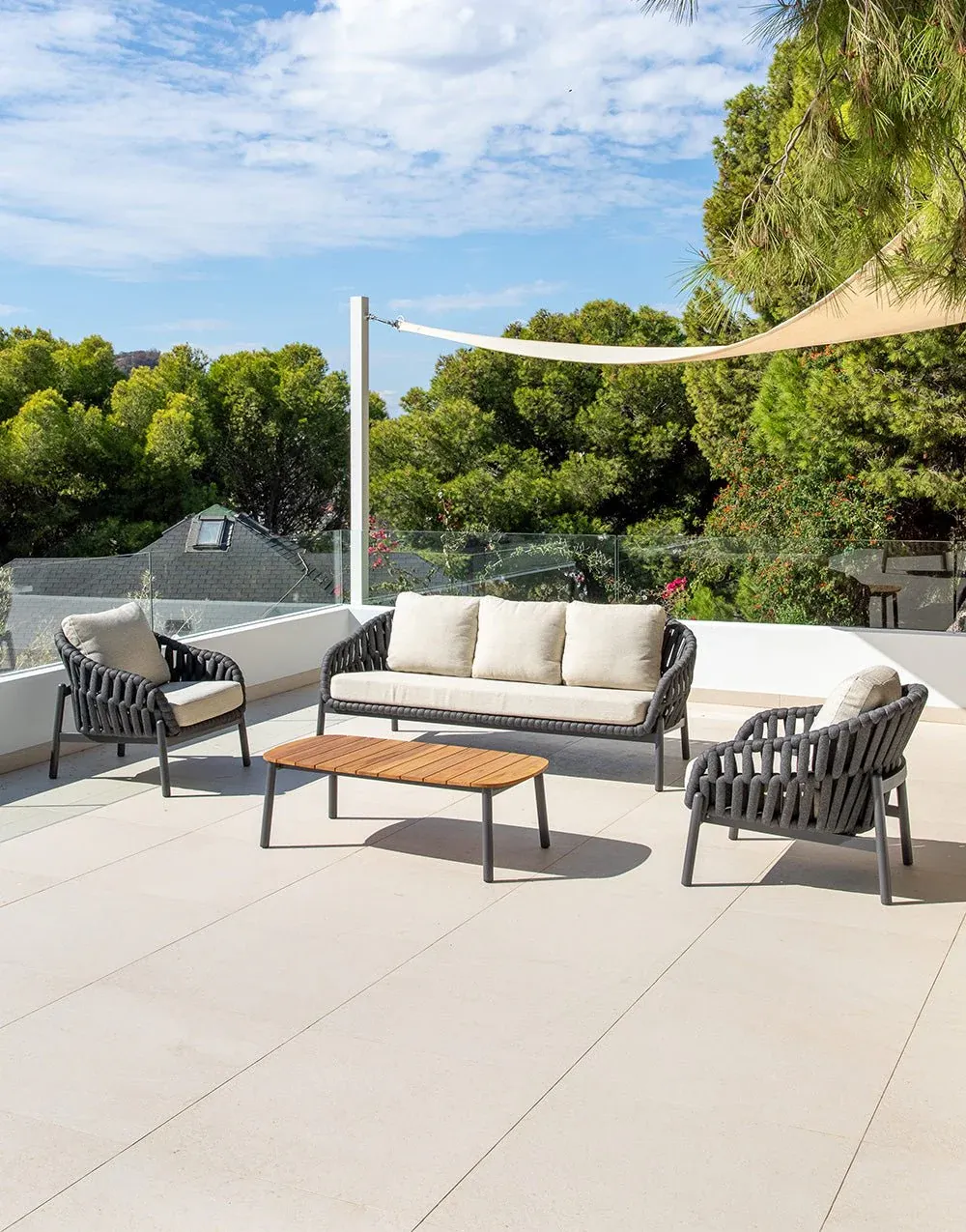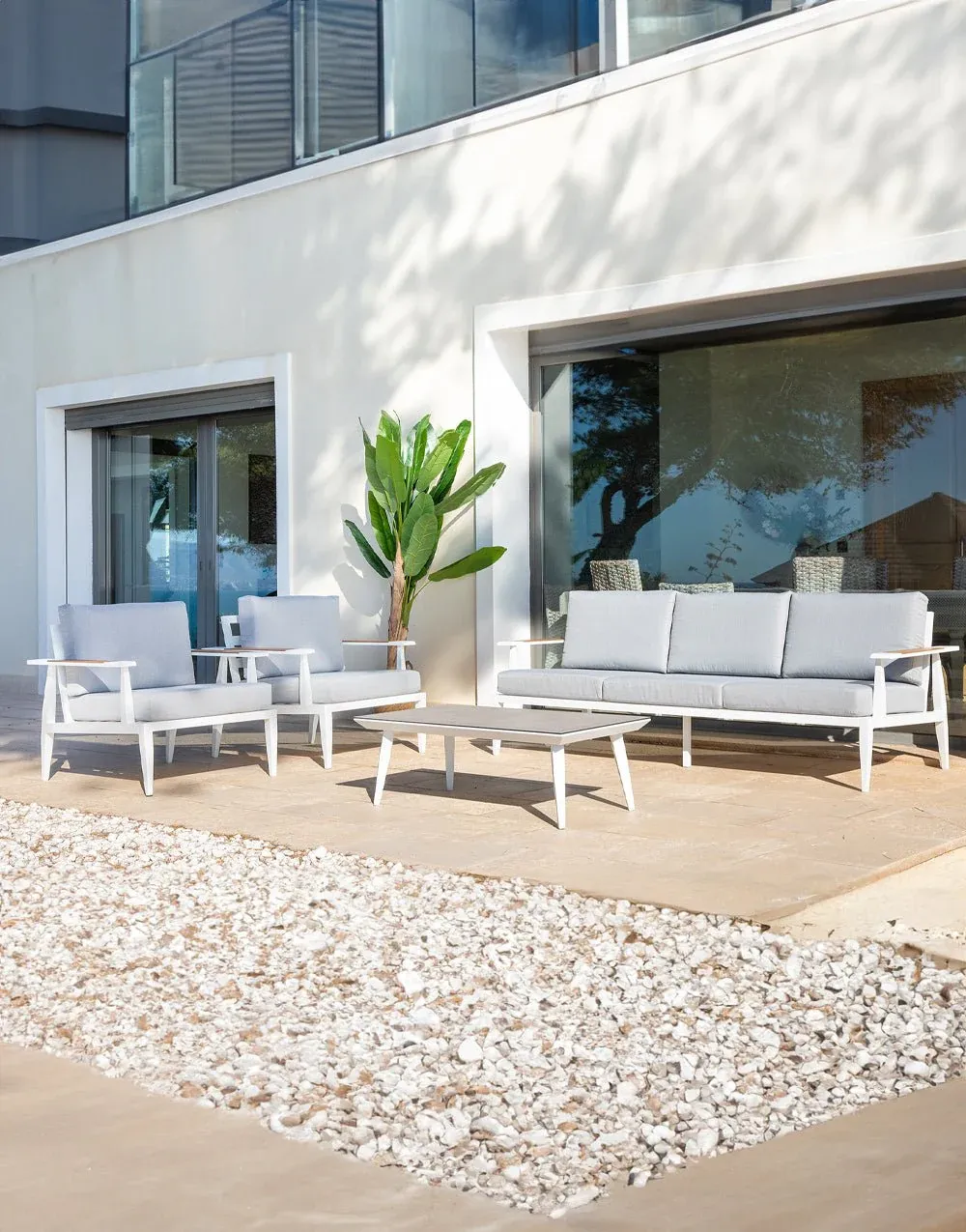 Set compuesto por 1 sofá + 2 sillones + mesa fabricado en aluminio de color blanco. Detalle de teca en los reposabrazos. Cojinería de color gris. Mesa de aluminio con tablero de cristal cerámico imitación piedra.
