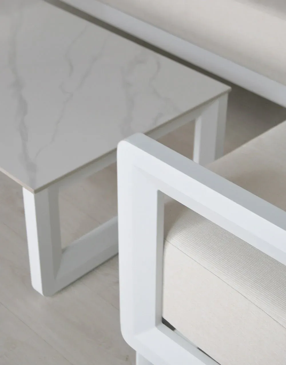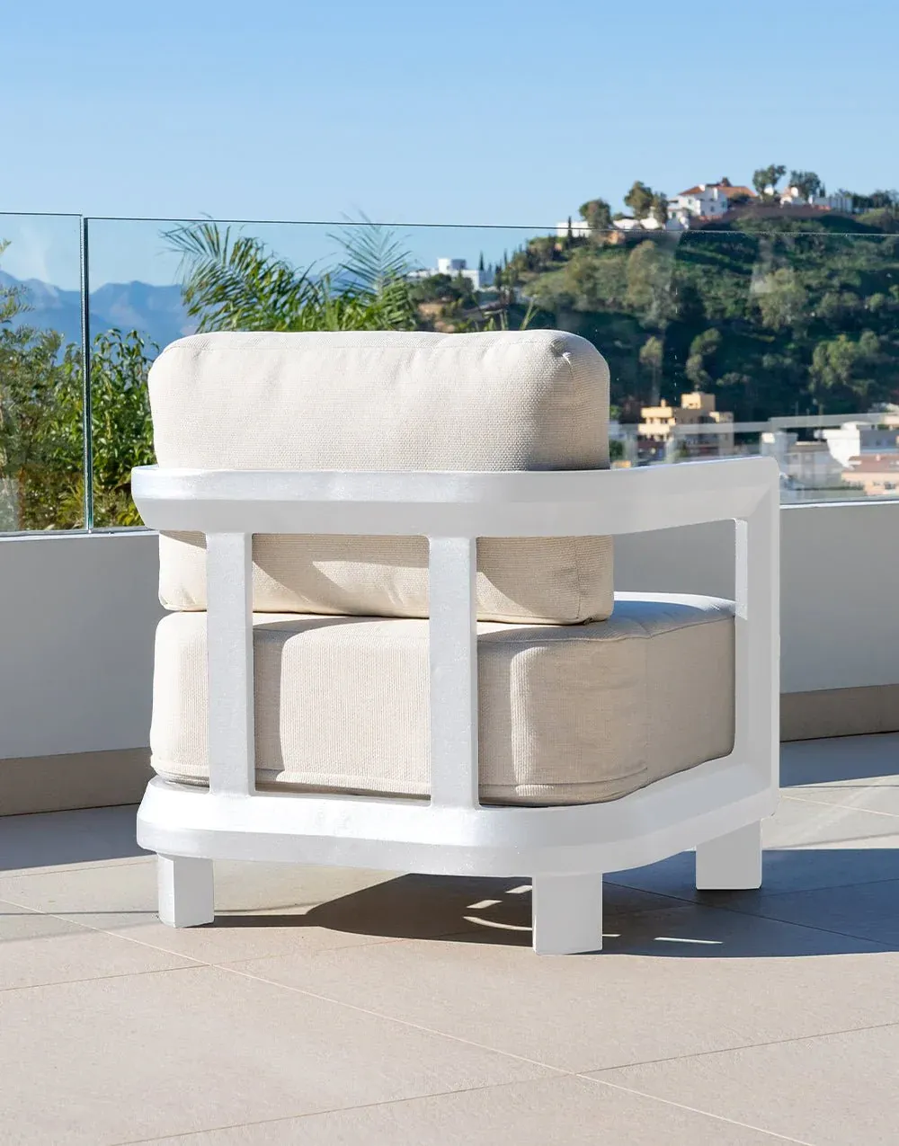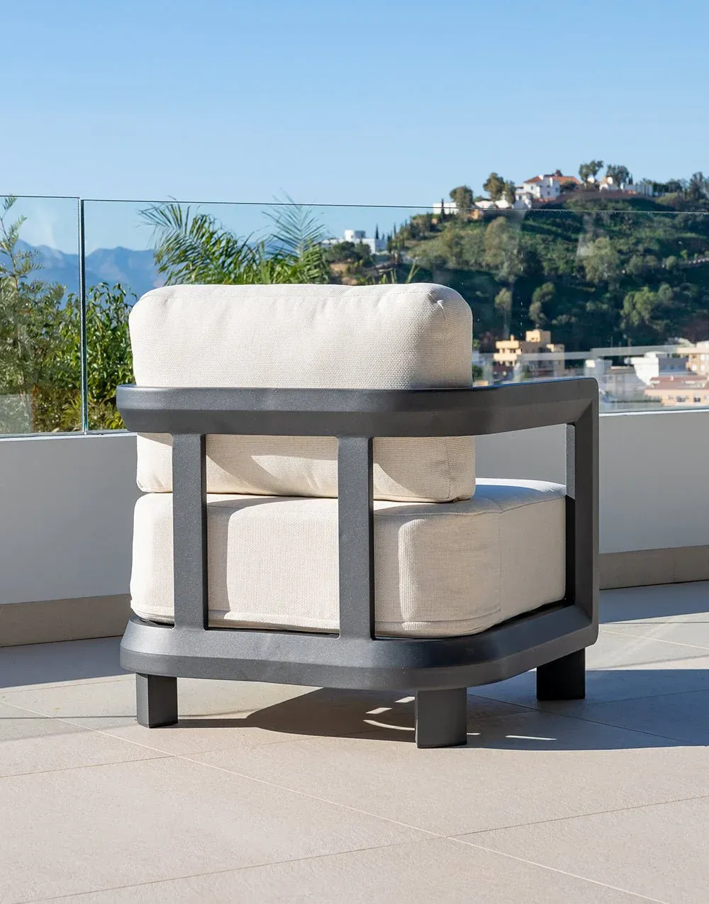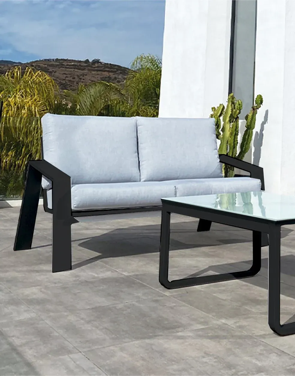 Set compuesto por sofá 3 plazas +2 sillones + mesa de centro. Fabricado en aluminio color antracita y blanco, cojines de olefina color beige y mesa de piedra sintética antracita y blanca.