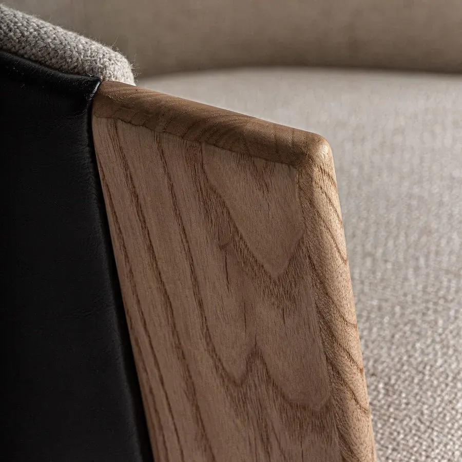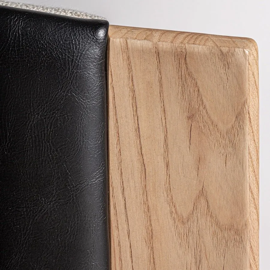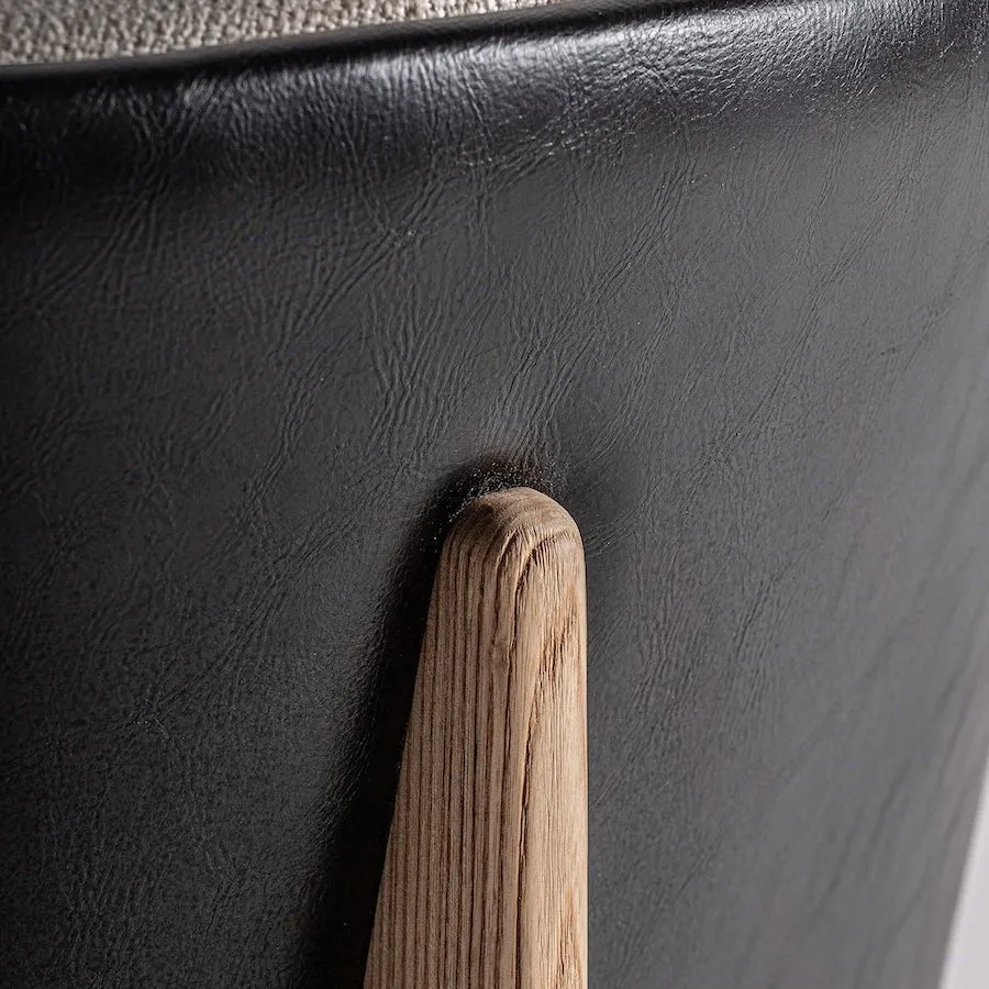 Silla de estilo contemporáneo fabricado en piel en color negro marrón combinado con madera roble en color marrón con acabado natural y poliéster en color beige con acabado jaspeado.