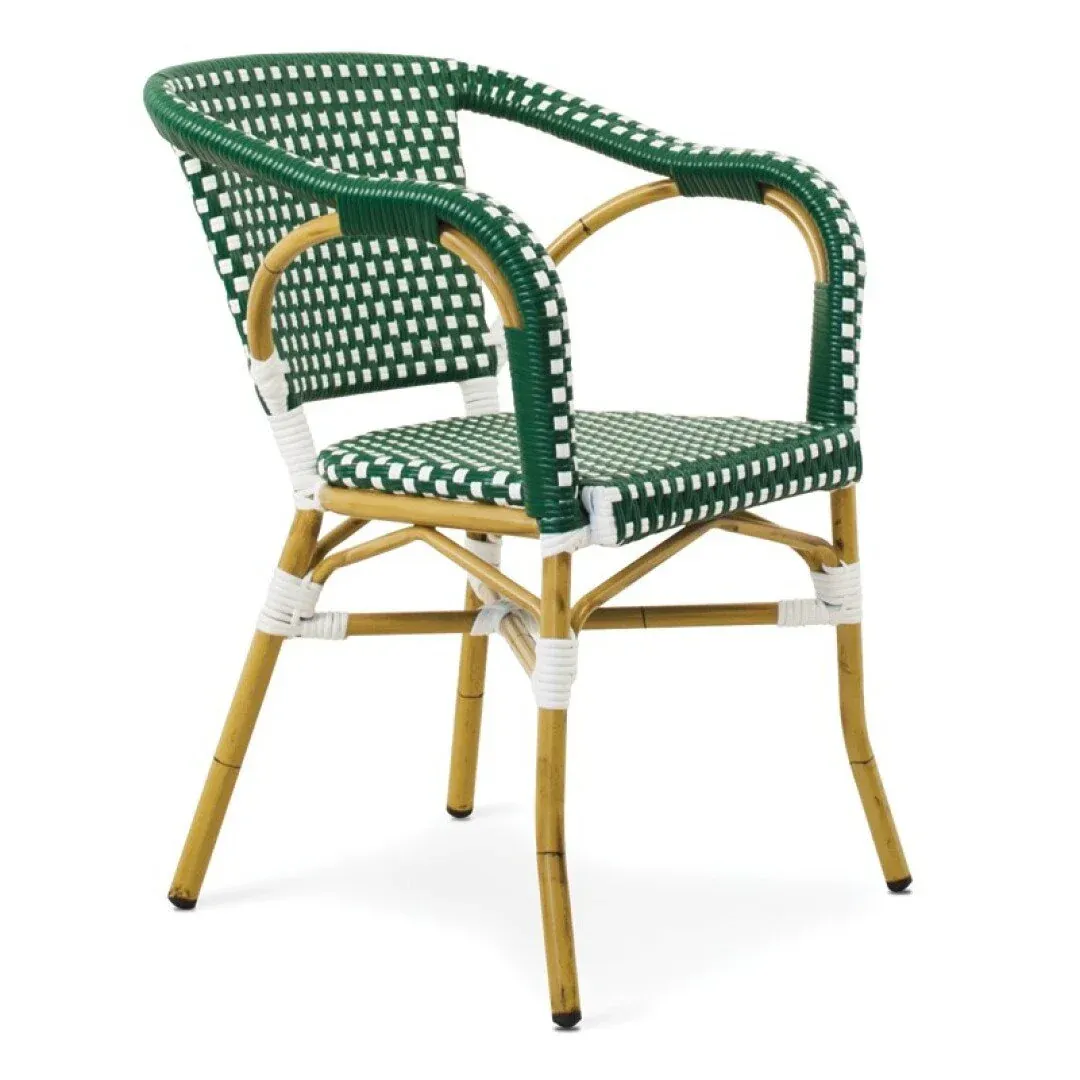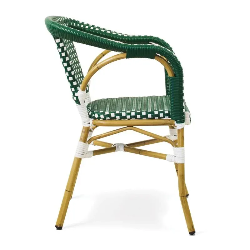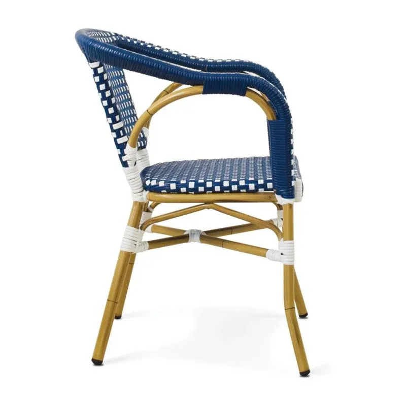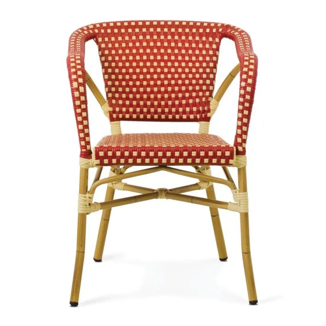 Silla con estructura de aluminio y acabado de ratán y tejido sintético disponible en cuatro colores: azul, rojo, verde y café.