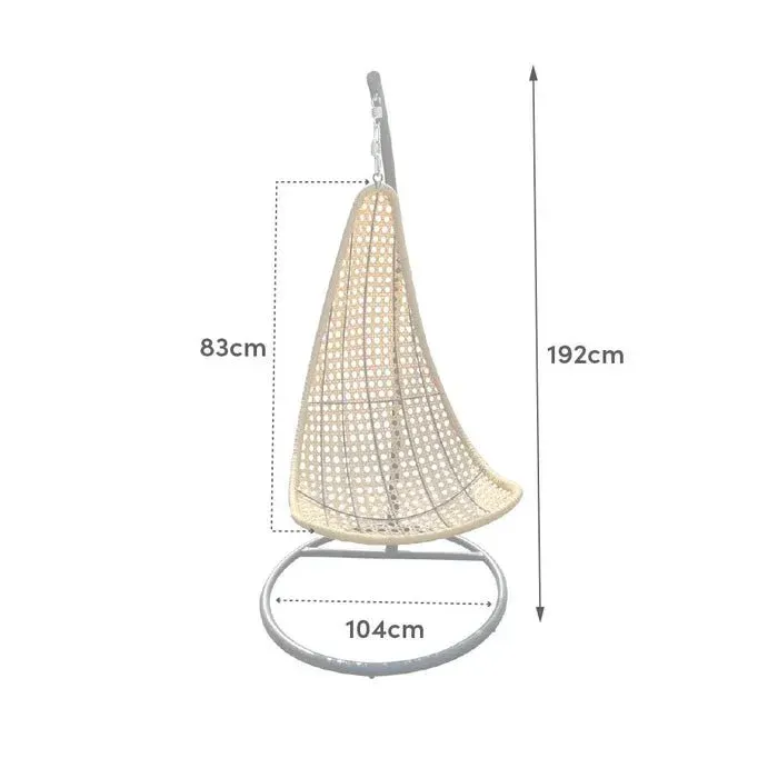 Silla de jardín de diseño colgante sostenida en un mástil de estructura tubular redonda de resistente acero unido al asiento mediante una cadena de eslabones con terminación de muelle.