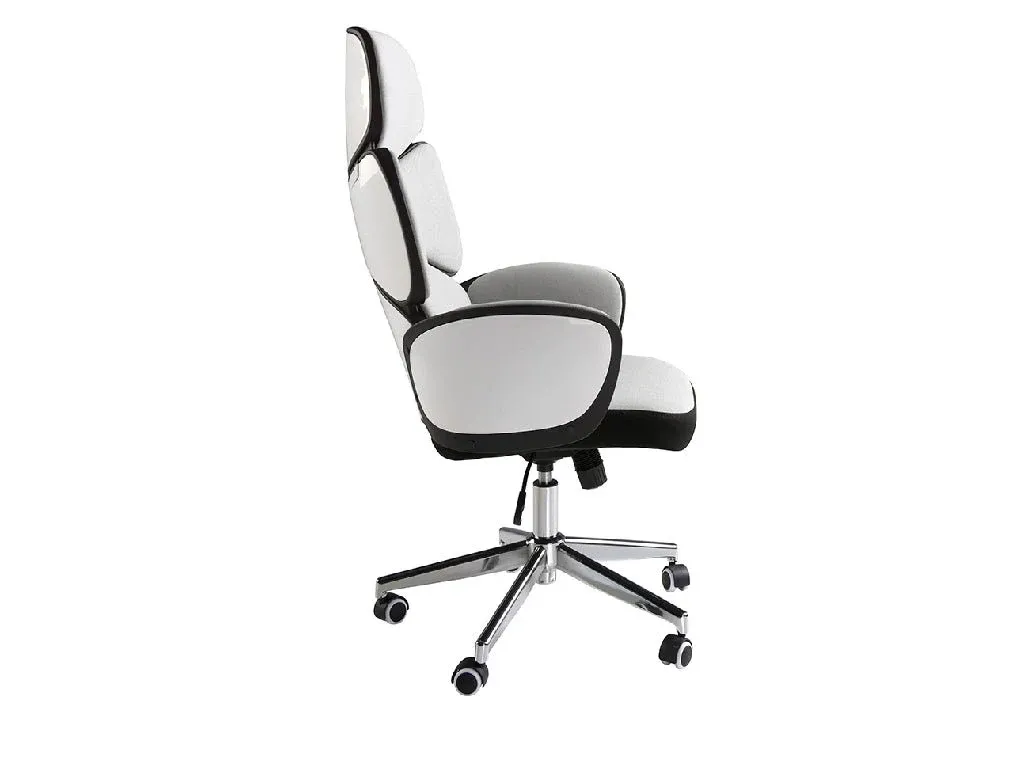 Silla oficina giratoria de diseño moderno con asiento tapizado en tela color gris claro y respaldo de pvc color blanco acabado brillo. Cuenta con reposabrazos, lo que le confiere una mayor comodidad. Sus patas en acero inoxidable cromado y su asiento regulable en altura. Sus ruedas aportarán el extra de practicidad que necesita en sus horas de trabajo o estudio.