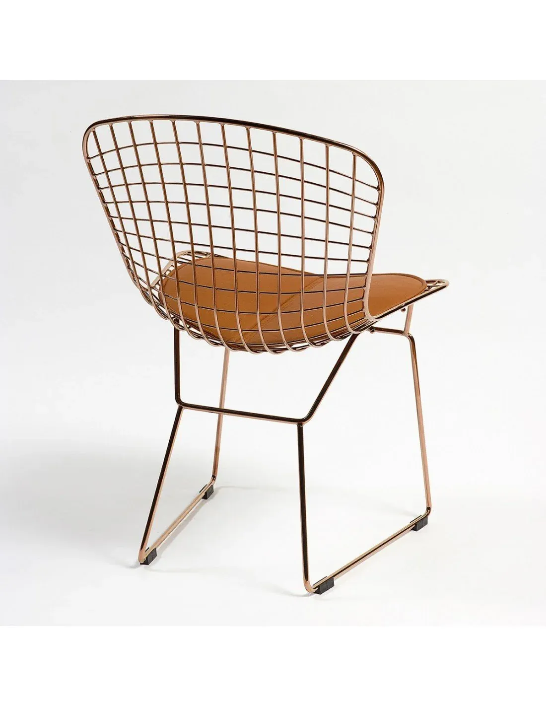 Silla metálica de color cobre rosado y asiento tapizado en color marrón. Combina, durabilidad y ligereza.