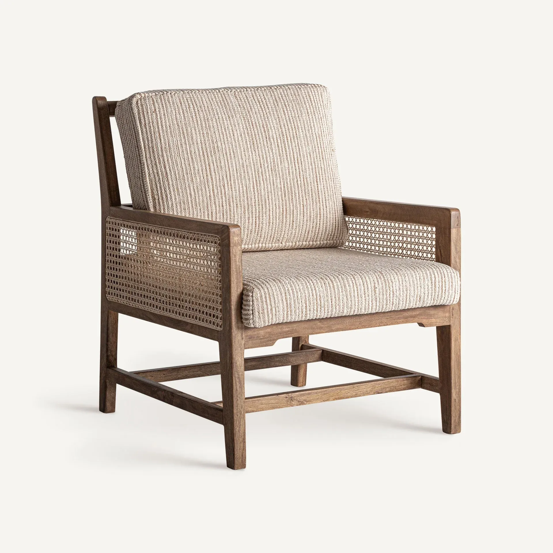 Sillón de estilo boho, fabricado en madera de fresno en color negro, combinado con latón en color marrón y ratán.