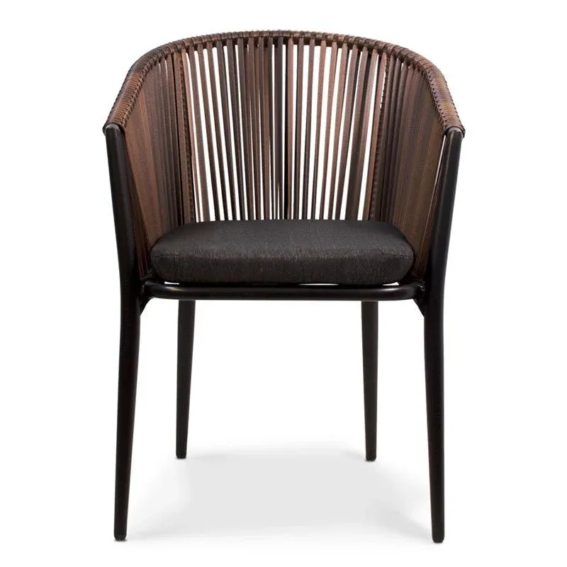 Sillón fabricado en aluminio combinado con tejido sintético color negro/chocolate, apto para uso exterior, apilable, incluye cojín y no requiere montaje.