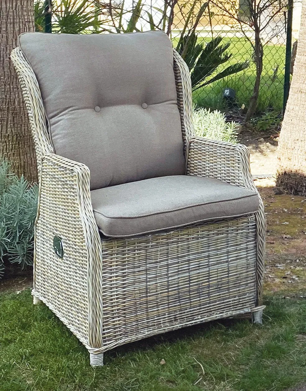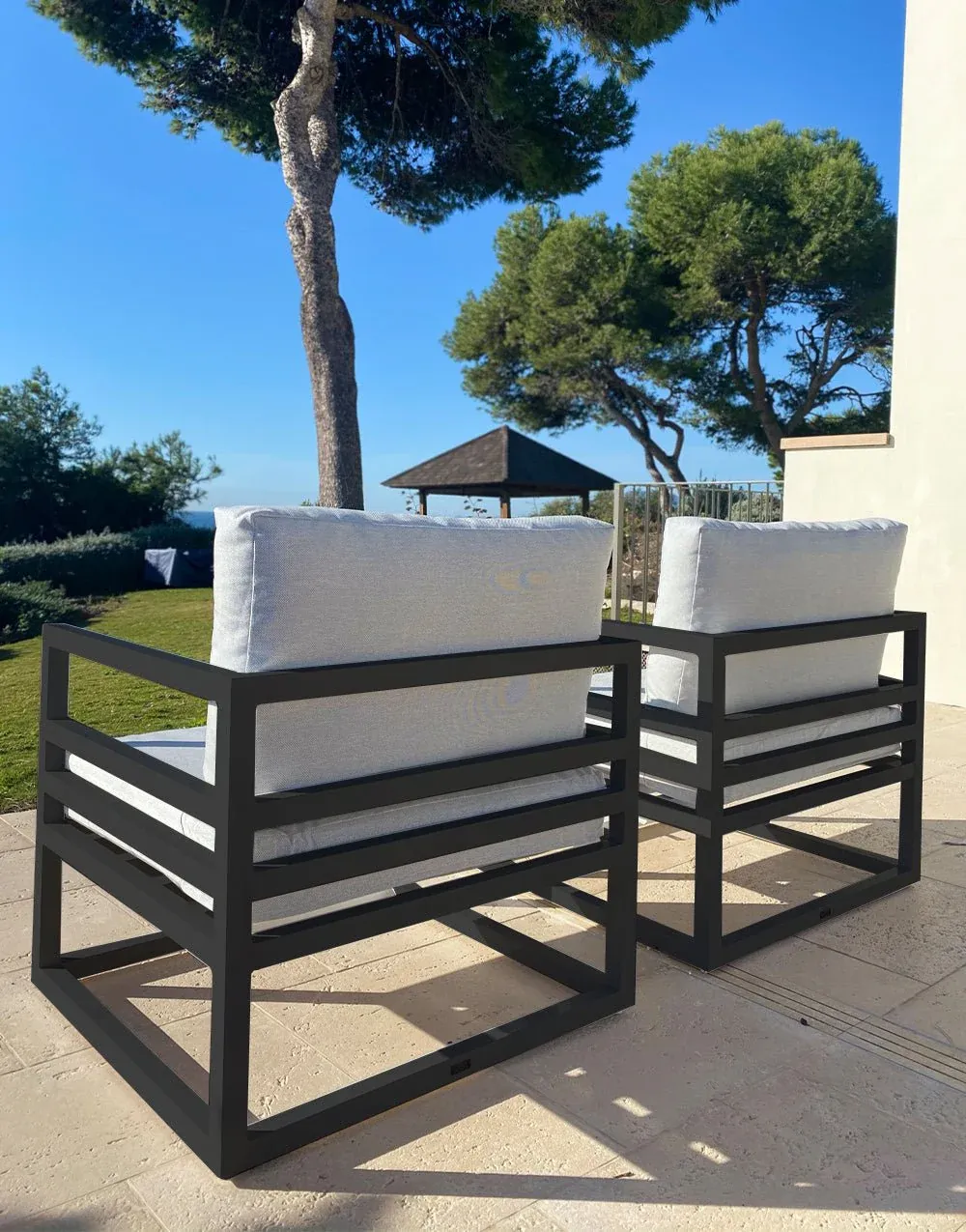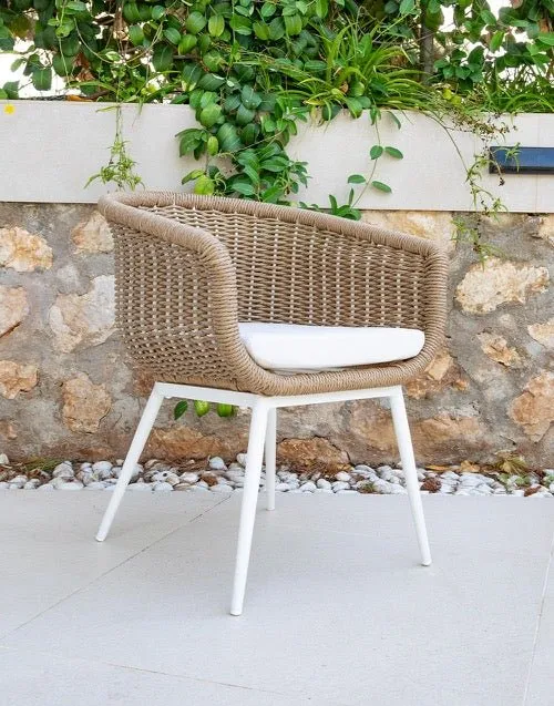 Sillón de exterior fabricado en aluminio color blanco con cojines de color gris.