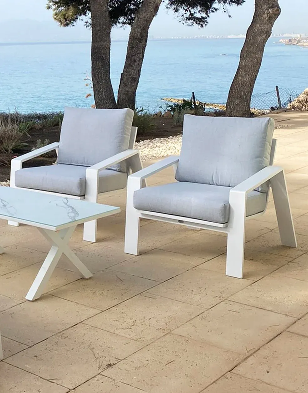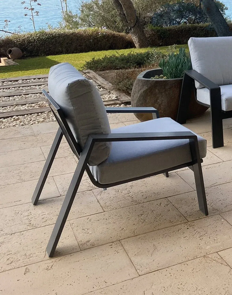 Sillón de exterior fabricado en aluminio color antracita o blanco con cojinería gris.