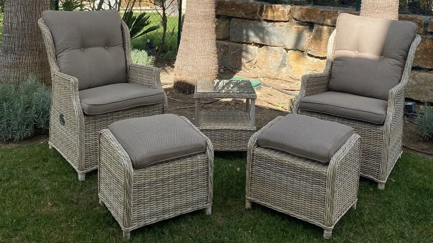 Sillon reclinable de aluminio y fibra sintética con cojines de color topo de 6 cm.