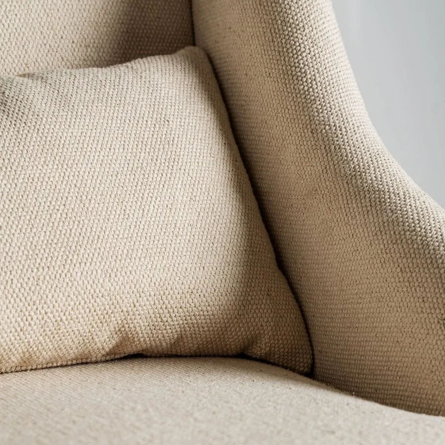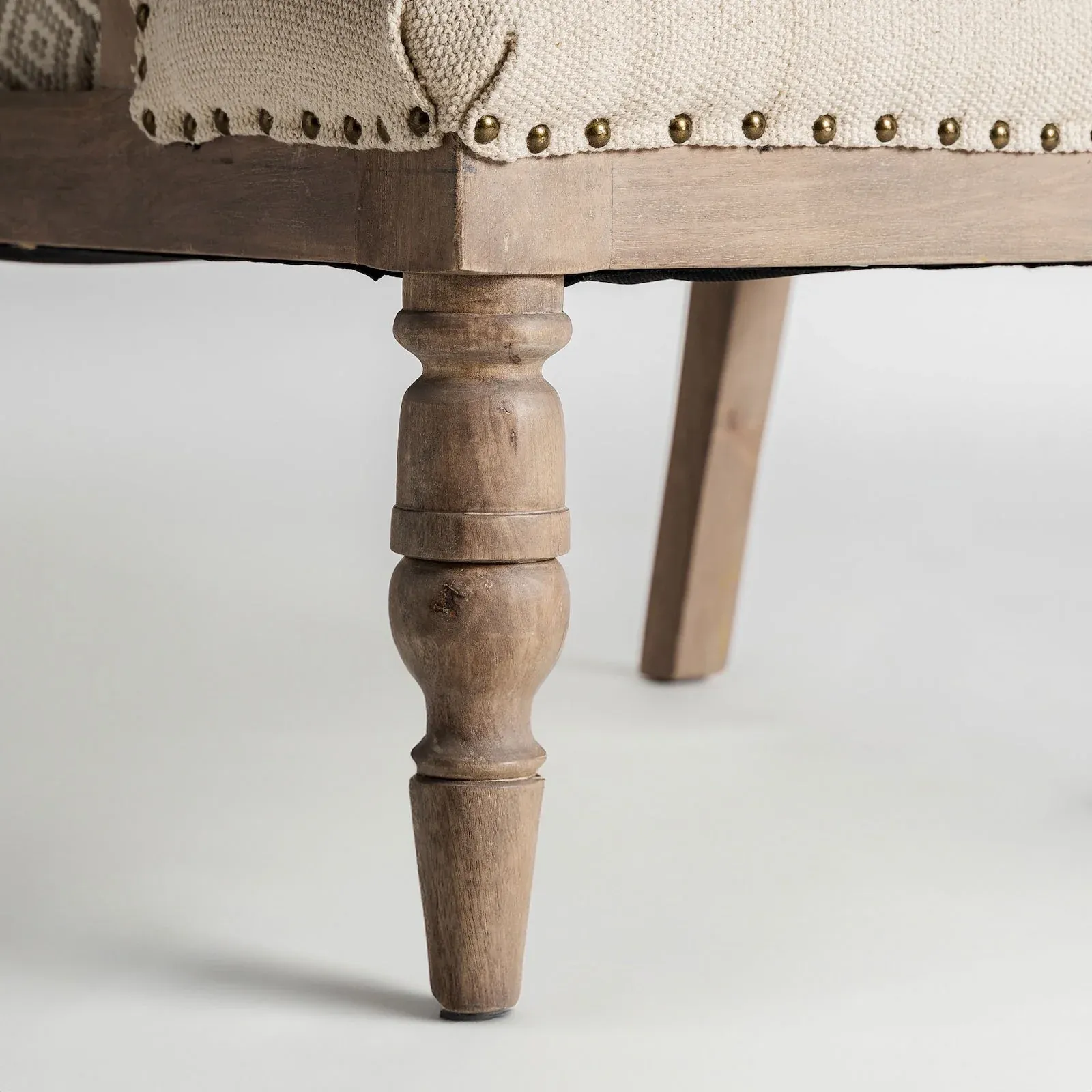 Sillón de estilo colonial, fabricado en madera de mango en color marrón, combinado con poliéster en color beige.