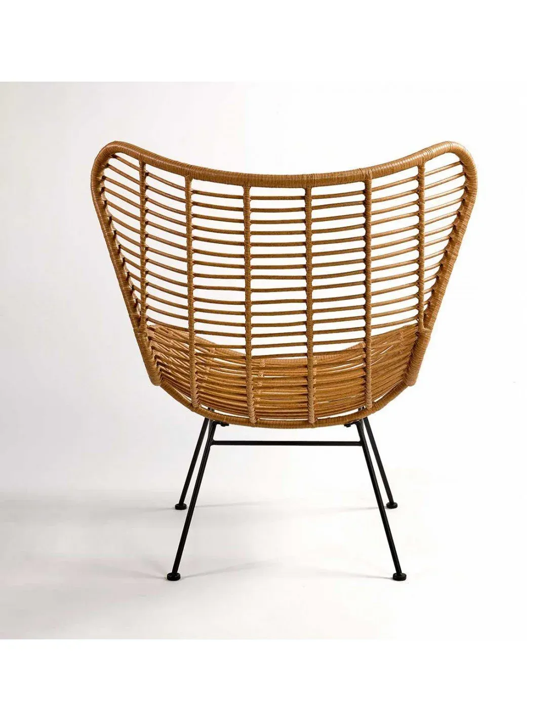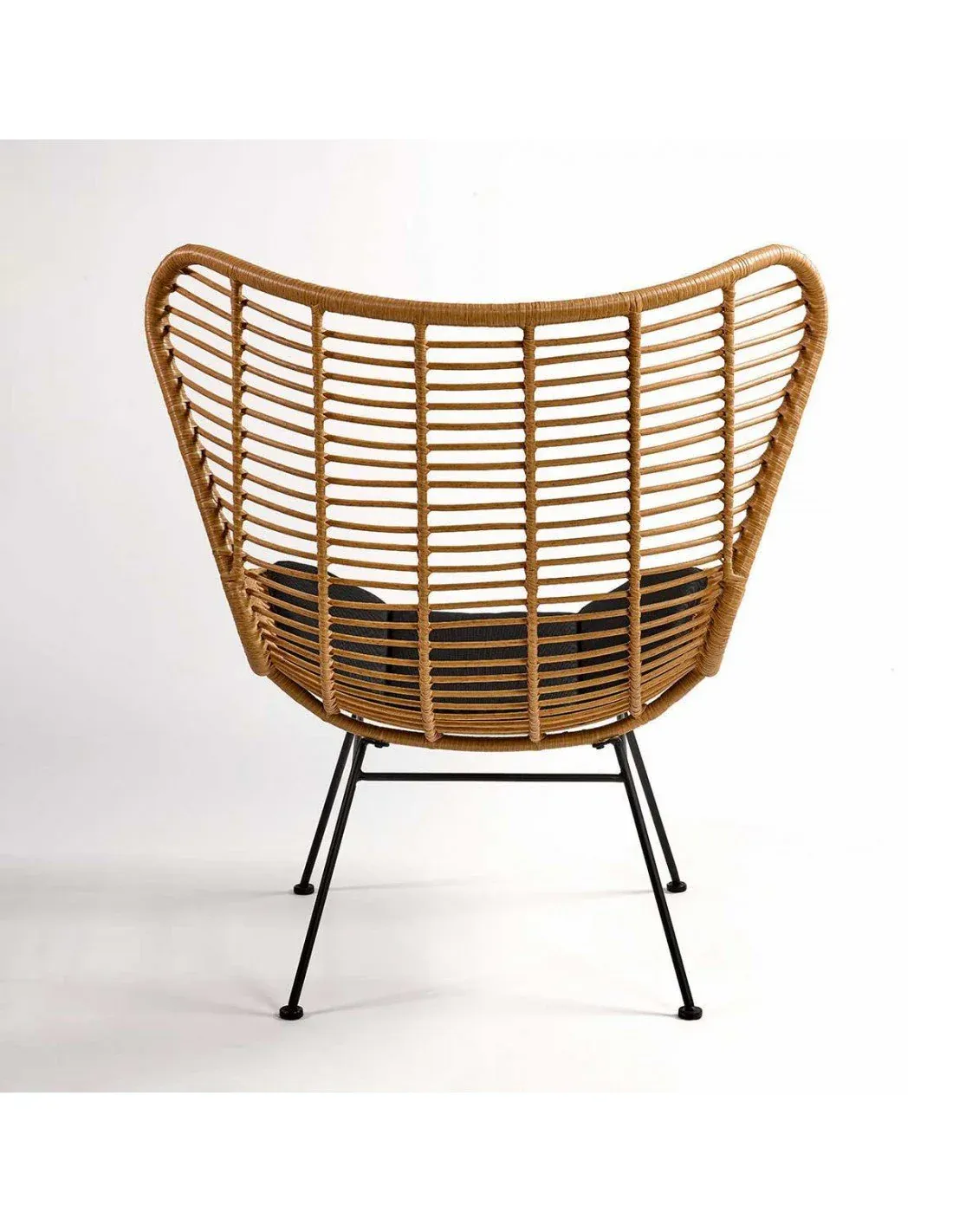Sillón de fibra sintética en color natural y estructura de metal de color negro. Asiento y respaldo curvado. Incluye cojín negro. Ideal para la decoración de tu jardín o terraza.