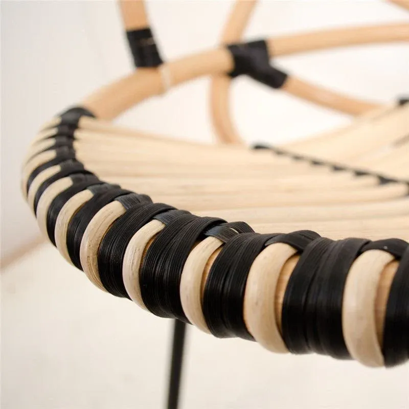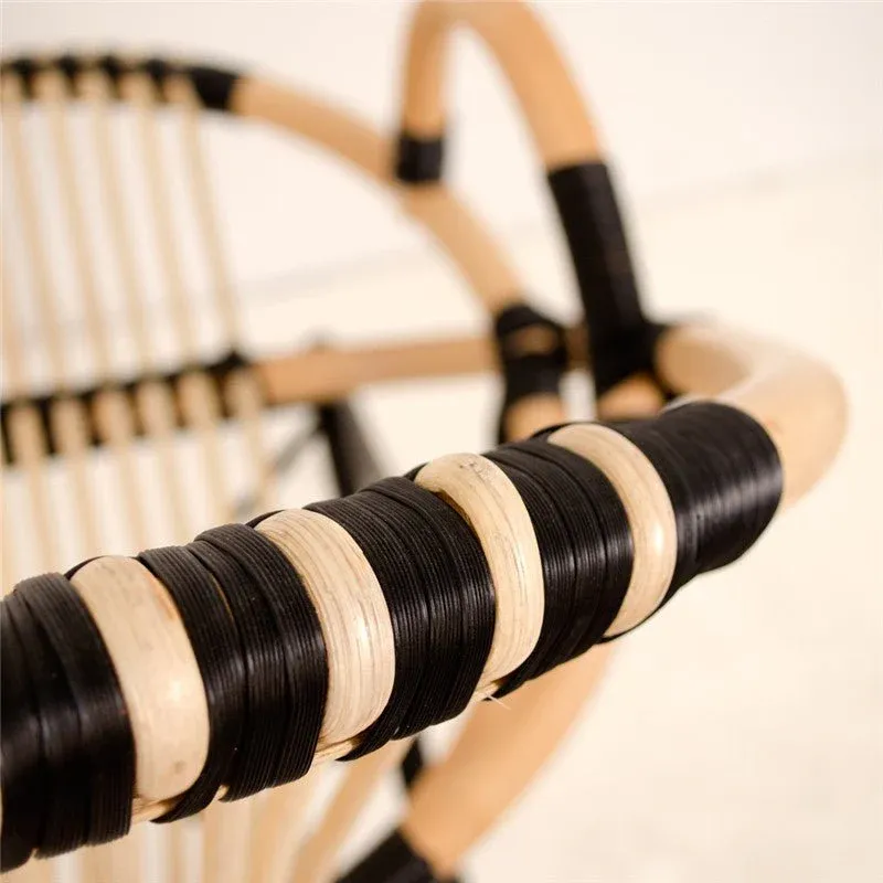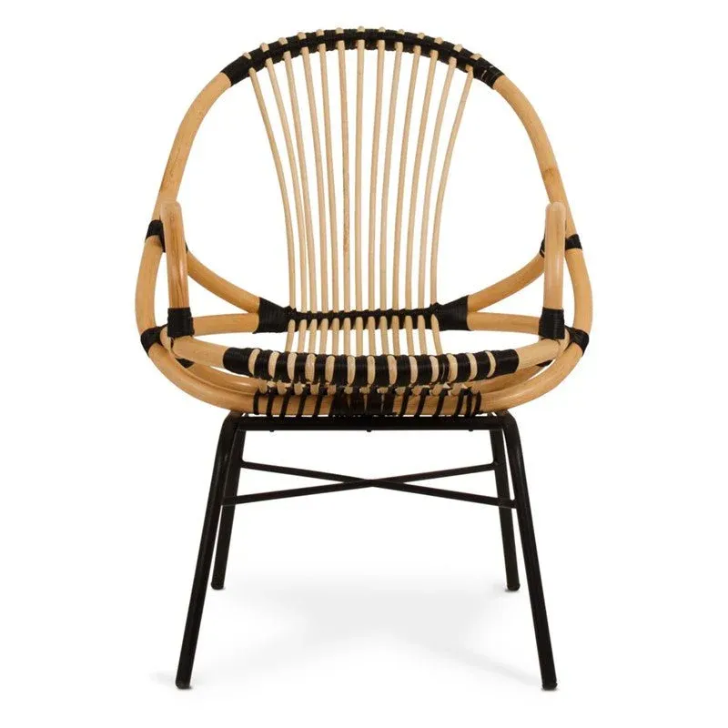 Sillón con estructura de patas en hierro negro combinado con caña natural y tejido sintético color negro. Recomendado para uso interior y exterior cubierto, apilable.