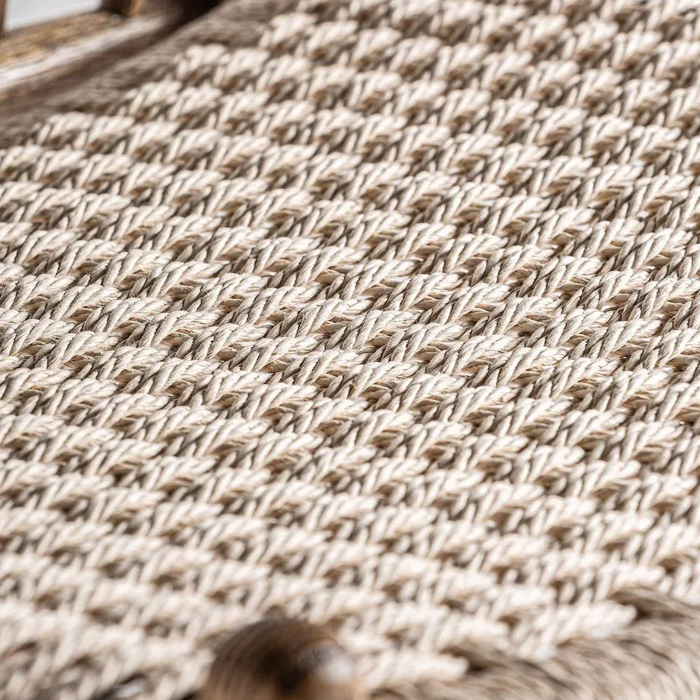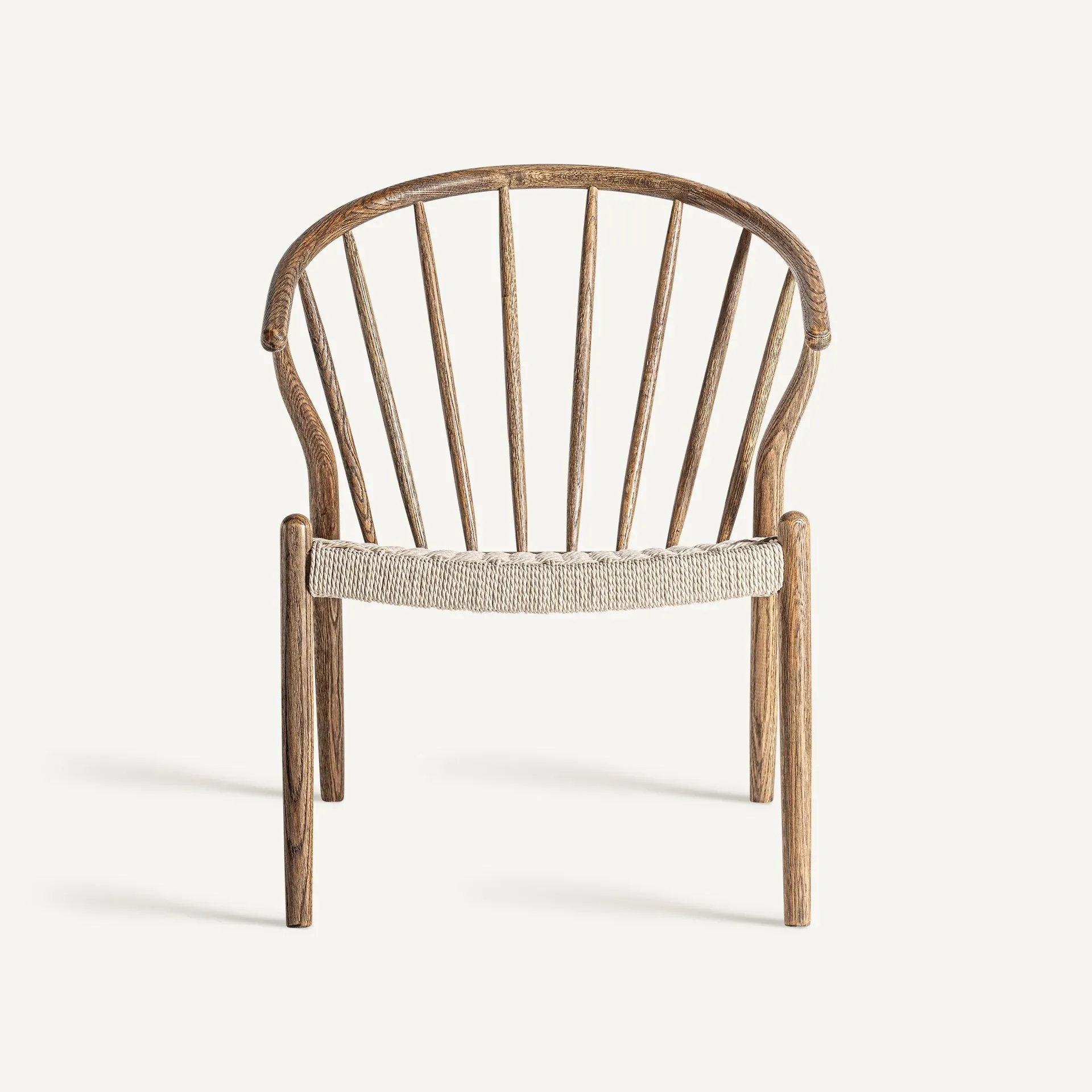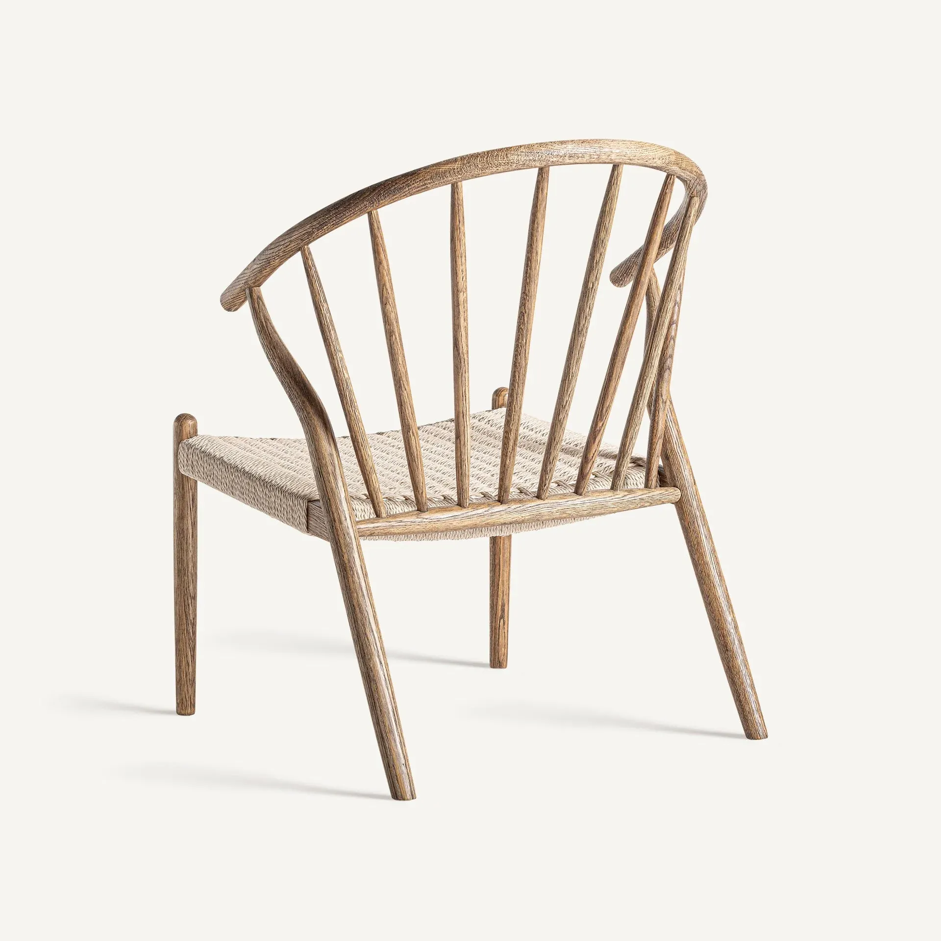 Sillón de estilo boho, fabricado en madera roble en color marrón, combinado con cuerda.