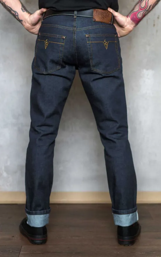 Estos jeans no están prelavados y son de color azul oscuro. El denim de algodón de alta calidad tiene una pequeña cantidad de elastano para una máxima comodidad. La parte delantera de los vaqueros es deliberadamente sencilla con un auténtico corte de cinco bolsillos. En la parte trasera presenta grandes bolsillos con logo V-59 bordado y etiqueta en color marrón. Los pantalones se cierran con una bragueta de botones convencional. Los remaches en forma de tuercas y botones con logo en latón antiguo combinan a la perfección con el clásico color de costura de contraste y completan perfectamente los vaqueros. ¡Ponte tus zapatos de baile y consigue estos jeans súper cómodos ahora!