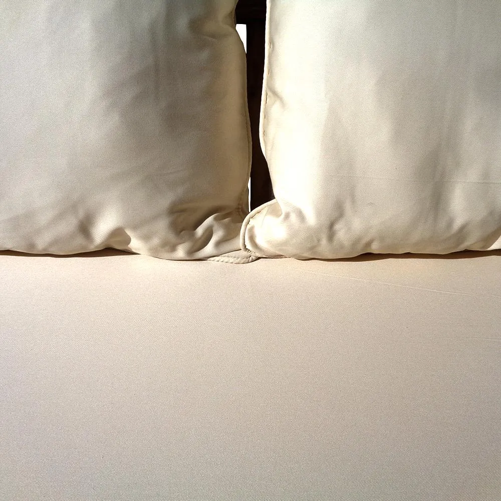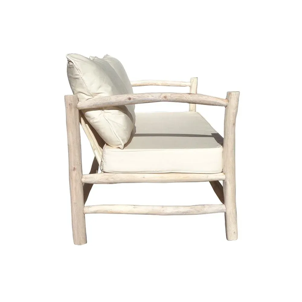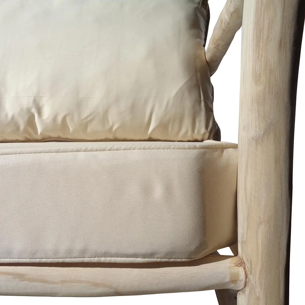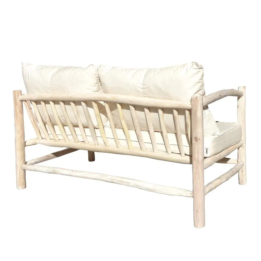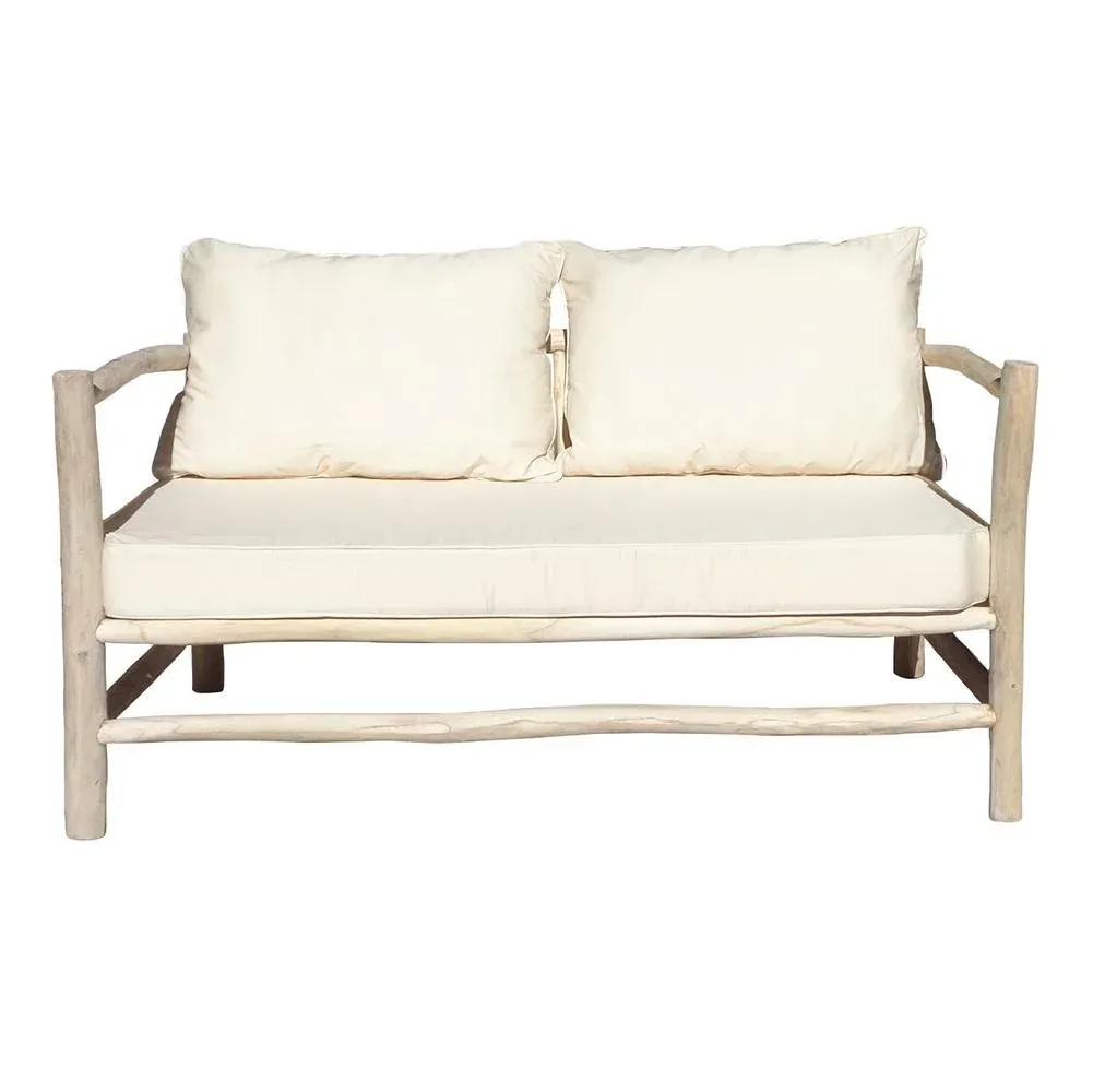 Sofá con estructura de madera de teca color natural y cojines 100% algodón color crudo. Cojines incluidos, desenfundables y con cierre de cremallera. No requiere montaje.