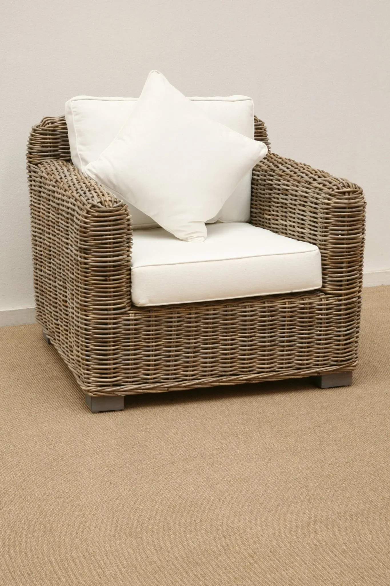 Sofá fabricado en kubu de color natural con cojines 100% algodón color blanco . Cojines incluidos, desenfundables y con cierre de cremallera. No requiere montaje.