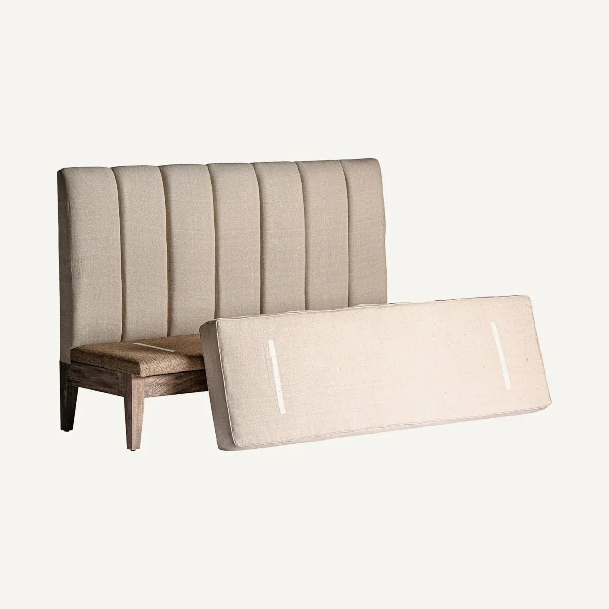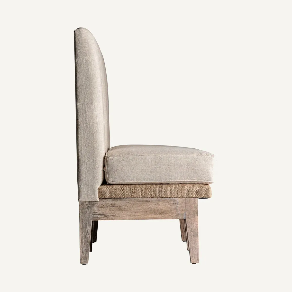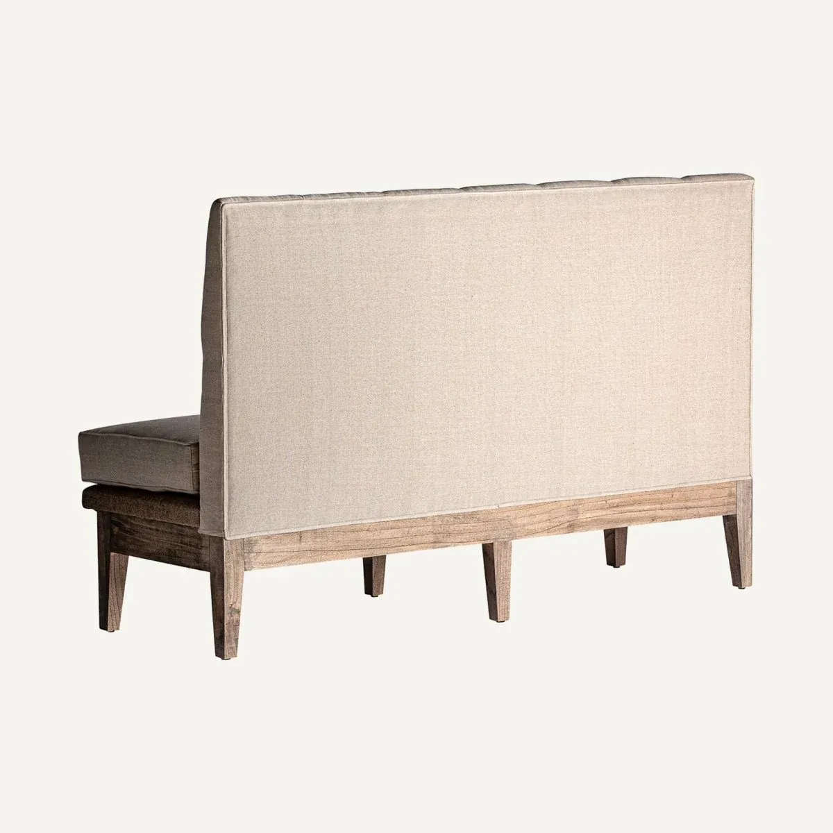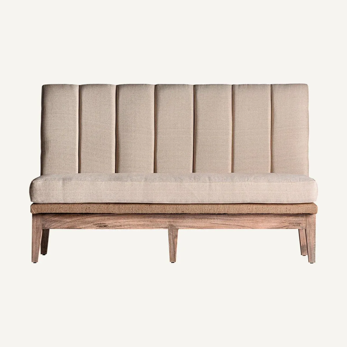 Sofá bar Celis fabricado en madera de teca combinado con lino en color crema de estilo provenzal.