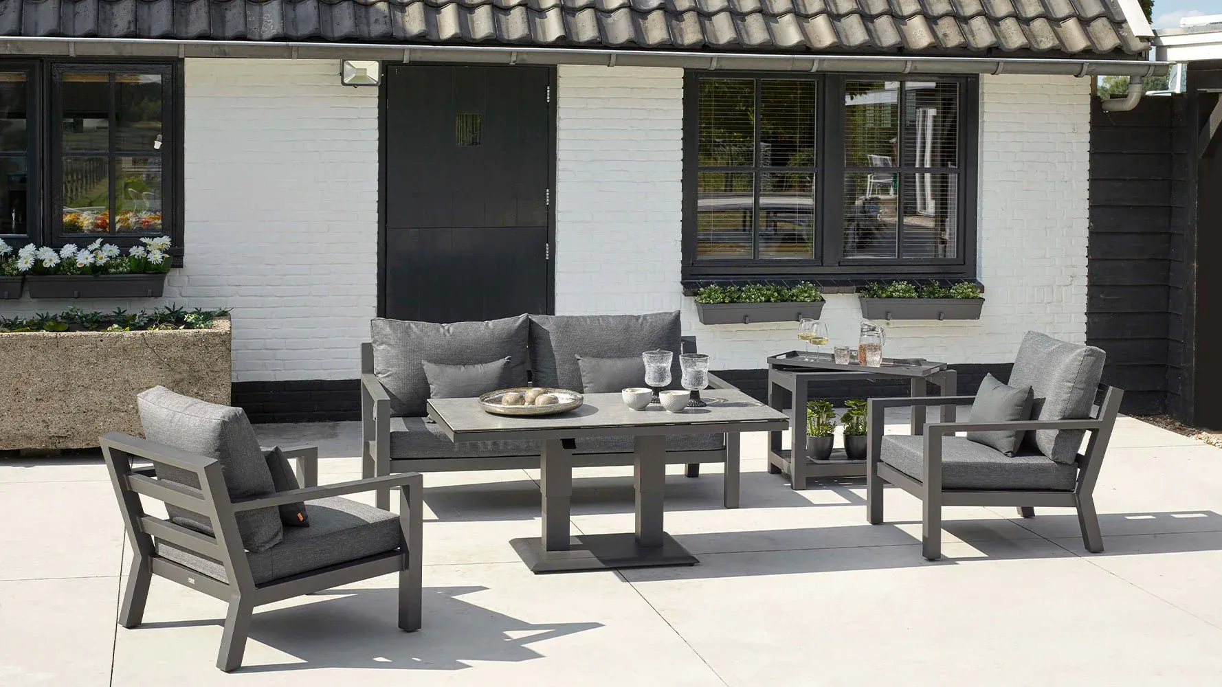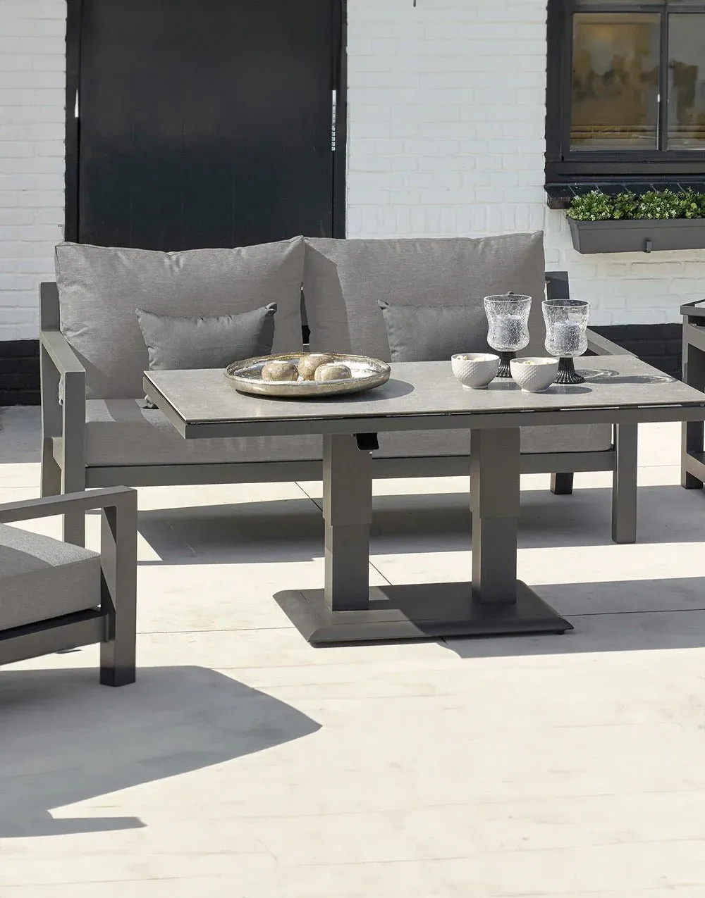 Sofá de aluminio de exterior de 2 plazas color antracita. Cojinería en Ivory soltex 100% de exterior en gris claro.