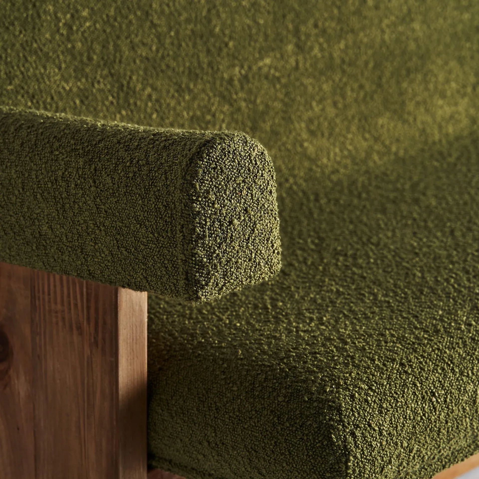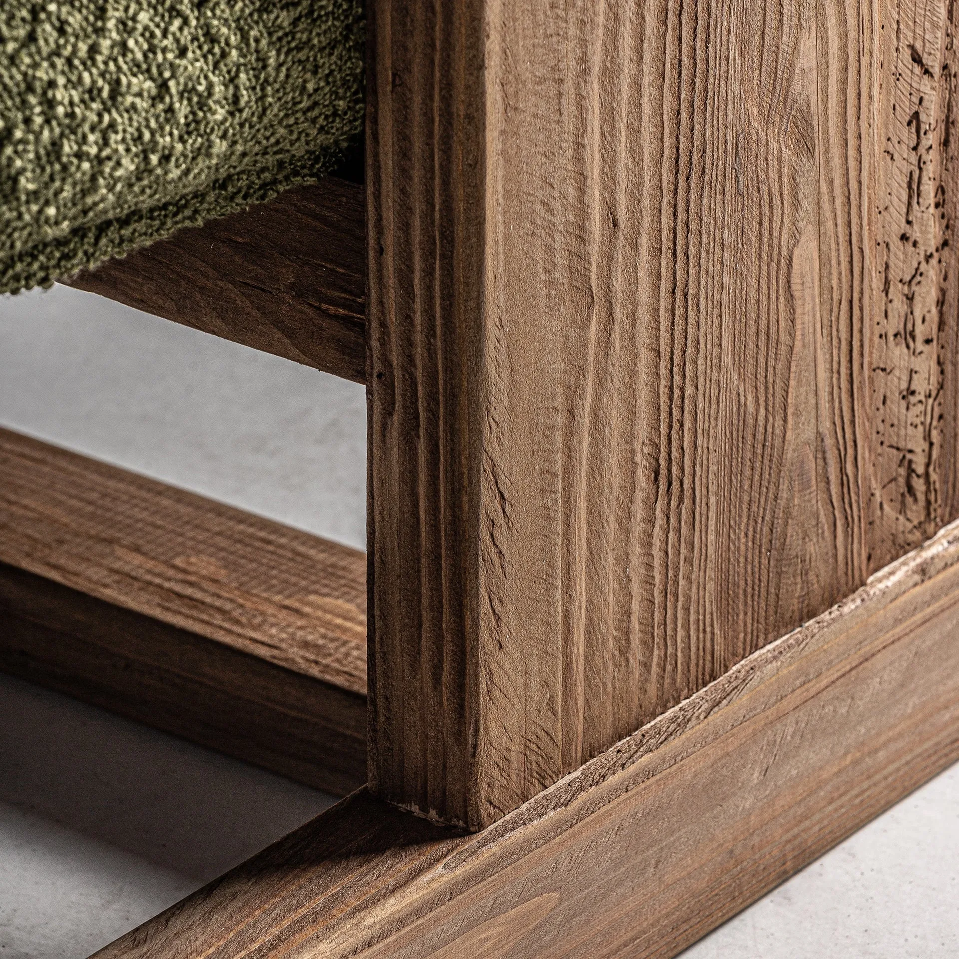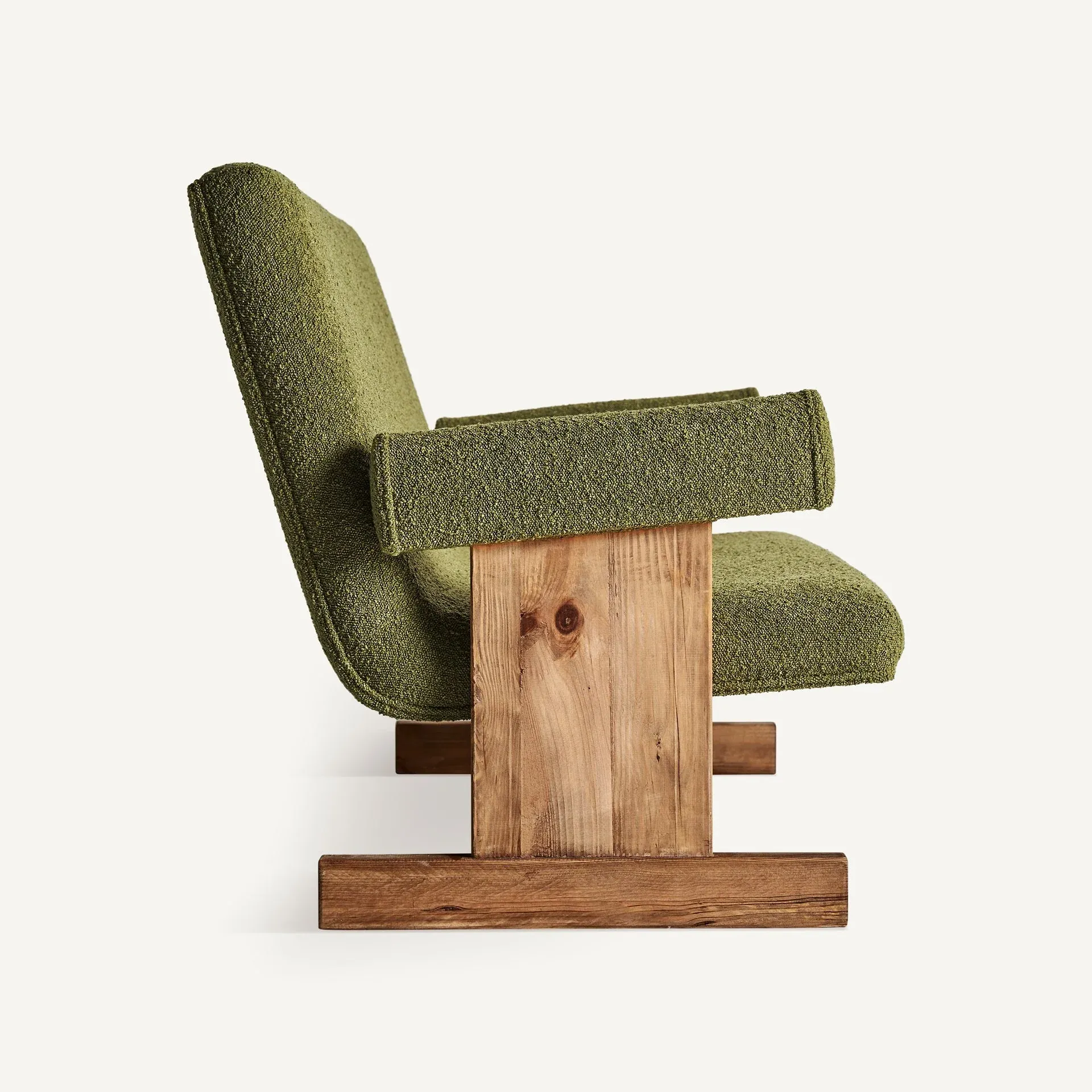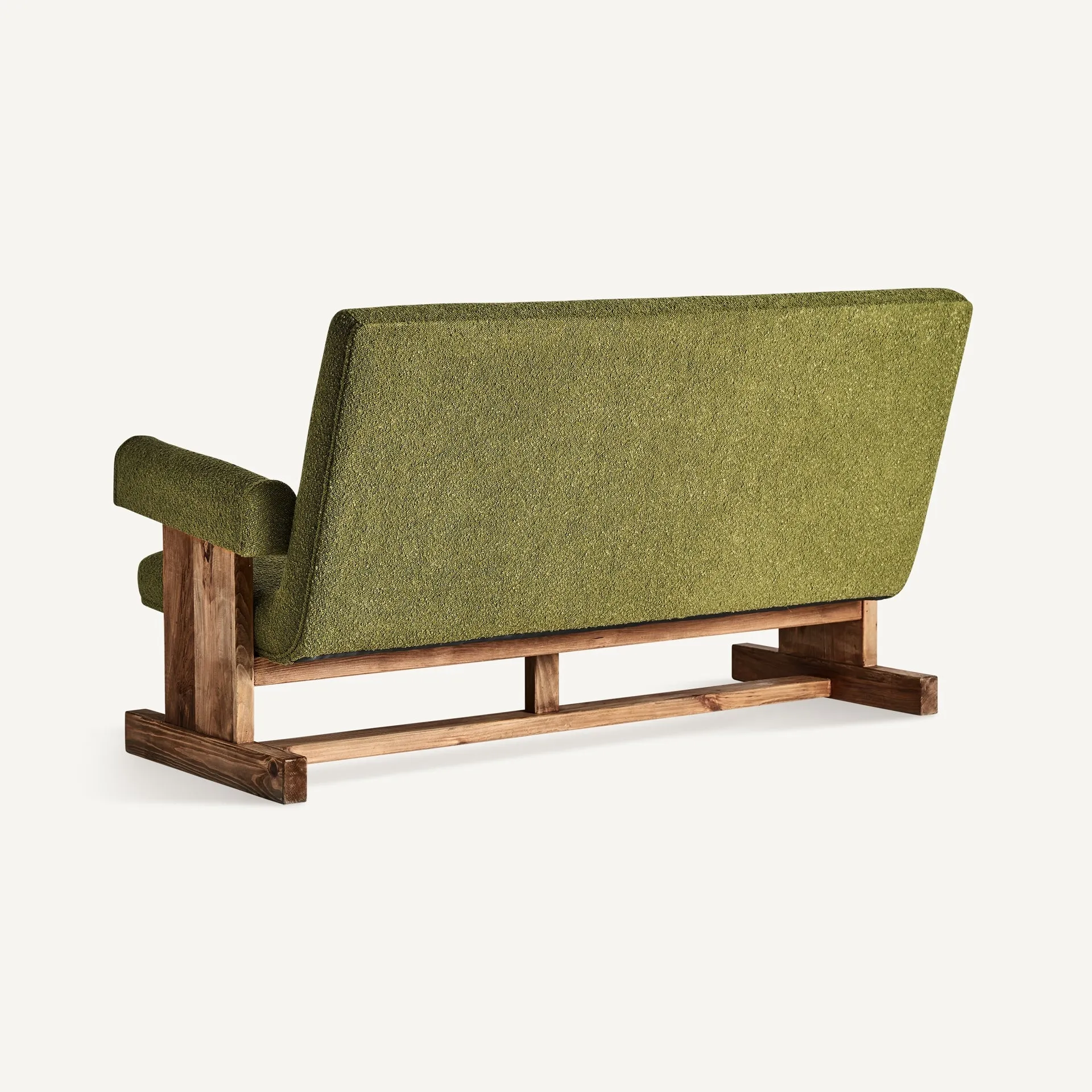 Sofá en color verde de estilo art deco fabricado en madera de pino reciclado combinado con poliéster.