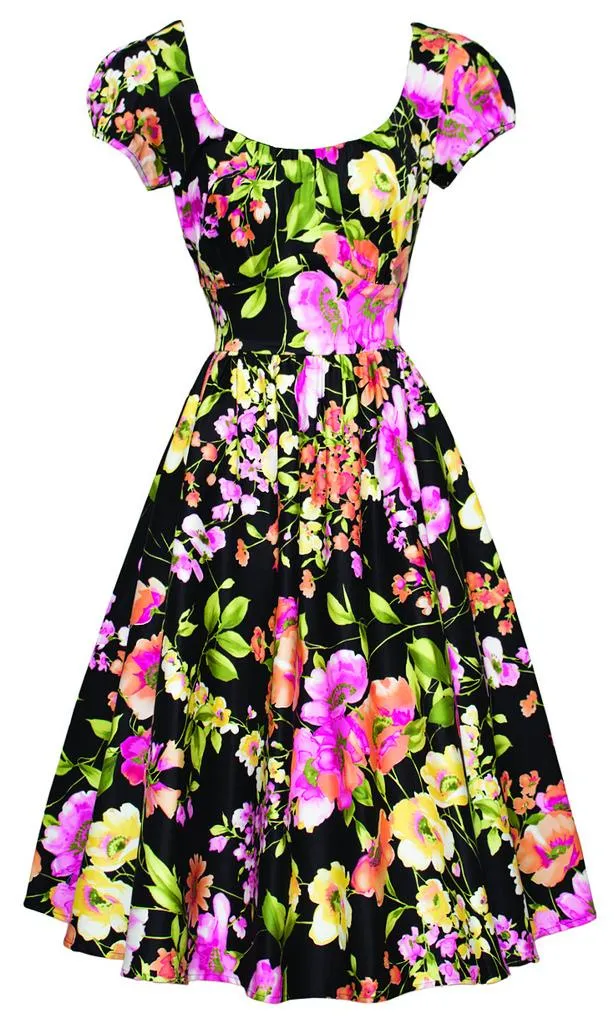Vestido de vuelo con estampado de flores. Se puede llevar con enaguas. Composición: 98% algodón y 2% spandex. Material de alta calidad. Fabricacion en USA.