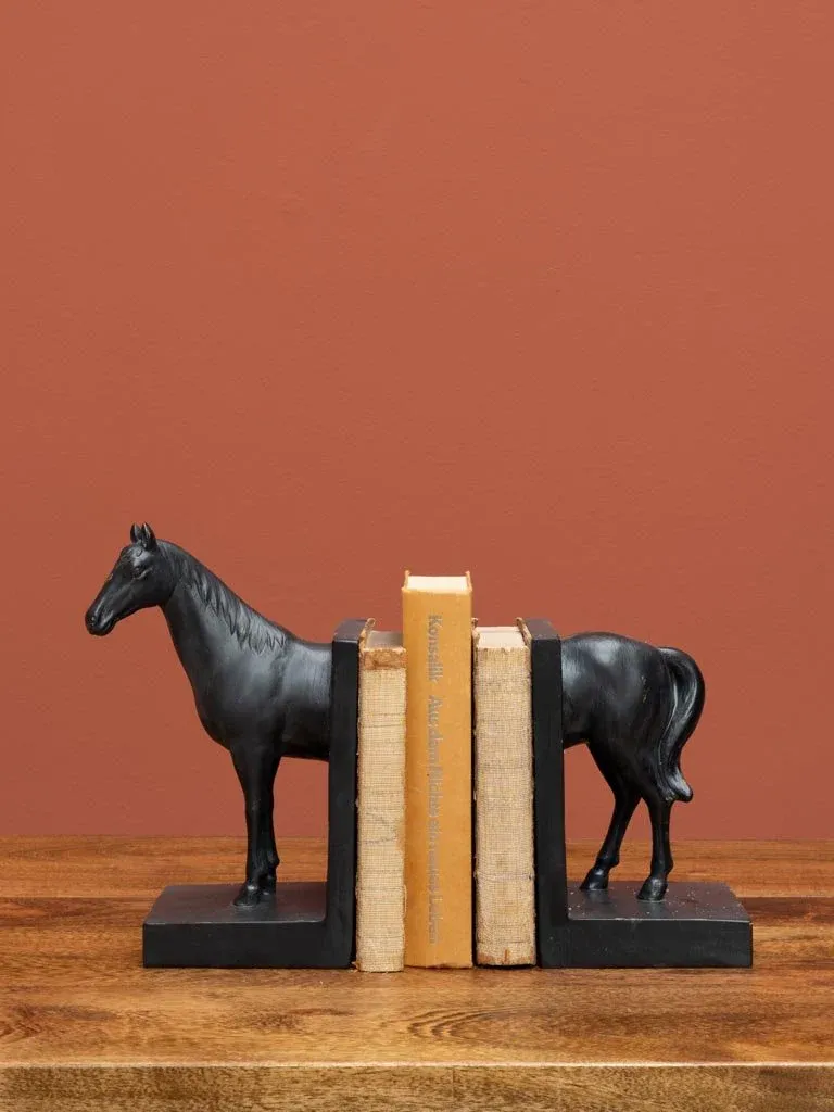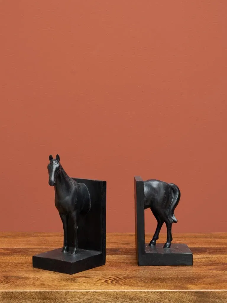 Precioso sujetalibros fabricado en resina en color negro con un original diseño de caballo dividido en dos unidades. El precio es por el set de dos.