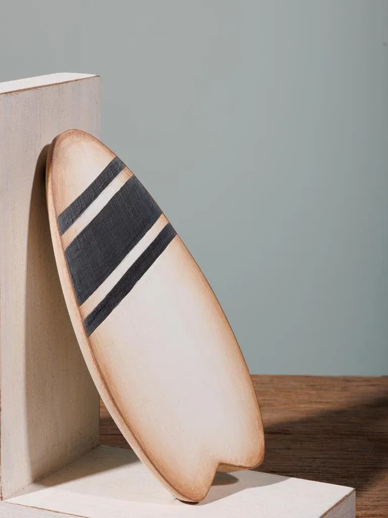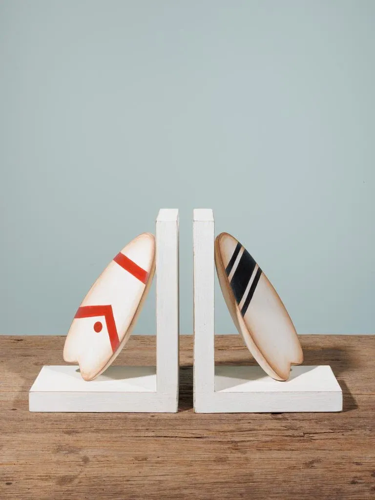Precioso sujetalibros fabricado en madera en color blanco, negro y rojo con un original diseño de tablas de surf dividido en dos unidades. El precio incluye el set de dos.