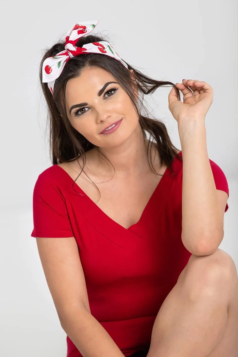 Bandana reversible con estampado de cerezas sobre fondo blanco, reversible en rojo liso.