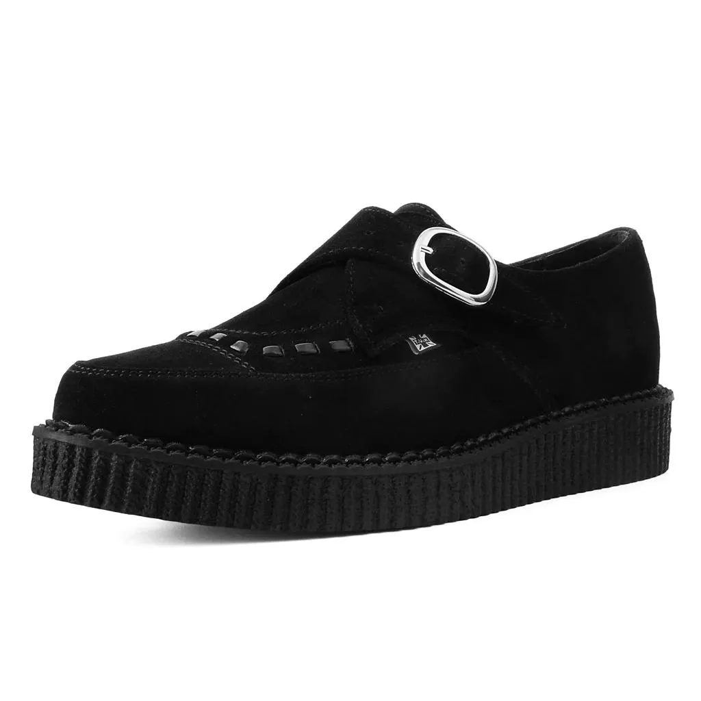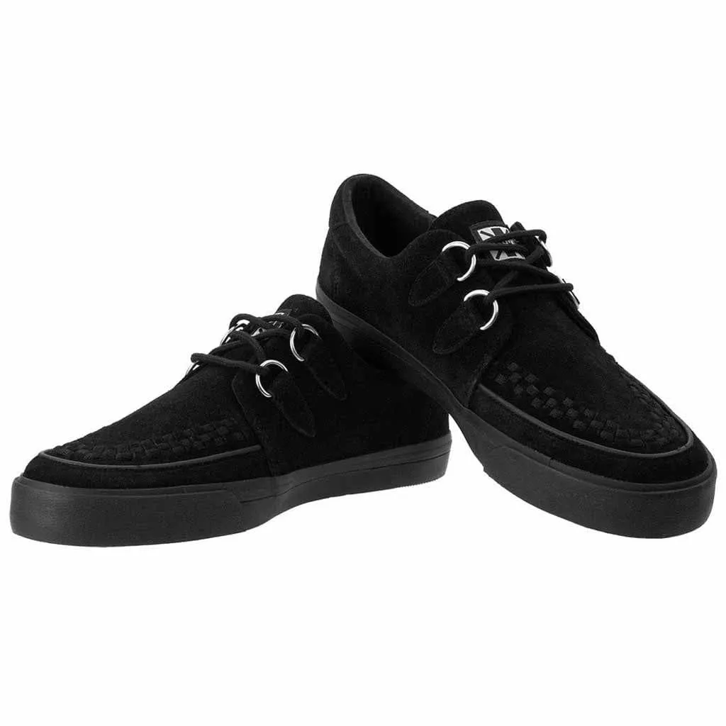 La única zapatilla T.U.K Creeper, ante negro clásico con entrelazado negro en contraste. Estilo icónico de perfil bajo con suela de calavera y huesos. Colecciónalos todos, complementa con correas bondage o colores de encaje.