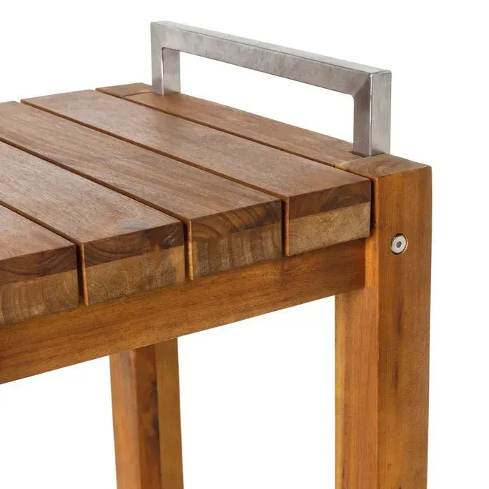 Precioso taburete alto fabricado en madera maciza de acacia con remates y herraje en acero inoxidable.