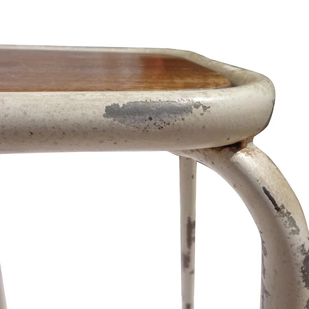 Taburete con estructura de hierro color blanco decapado y asiento de madera de mango color natural.