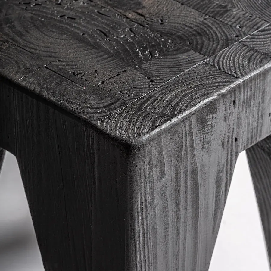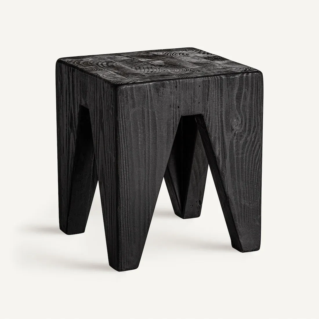 Taburete de estilo rústico, fabricado en madera de pino reciclado en color negro.