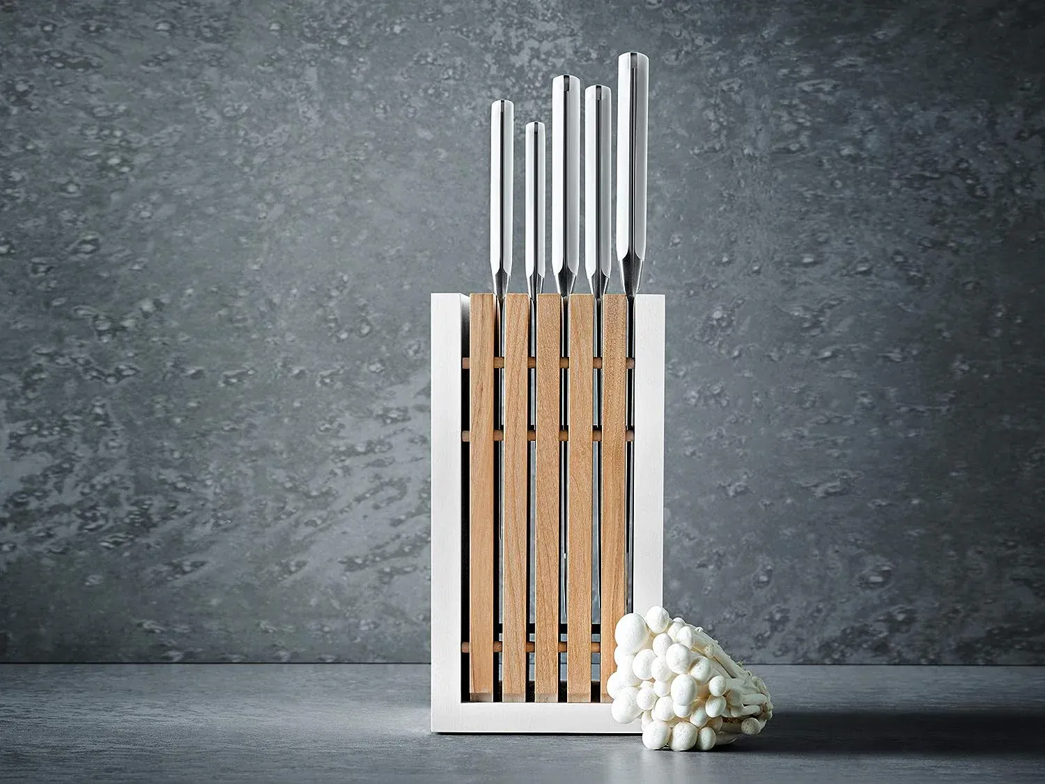 Además del santoku y el cuchillo de chef, este juego de cuchillos también contiene cuchillos que puedes utilizar para realizar tareas de corte más pequeñas: el cuchillo para pelar y el cuchillo para embutidos. Este último no solo es ideal para cortar salchichas, sino que también corta fácilmente tomates o bollos pequeños. Con el cuchillo de trinchar de este juego podrás cortar fácilmente trozos finos de carne. Guarda todos estos cuchillos en el impresionante y moderno bloque de cuchillos que lucirás increíble en tu encimera.